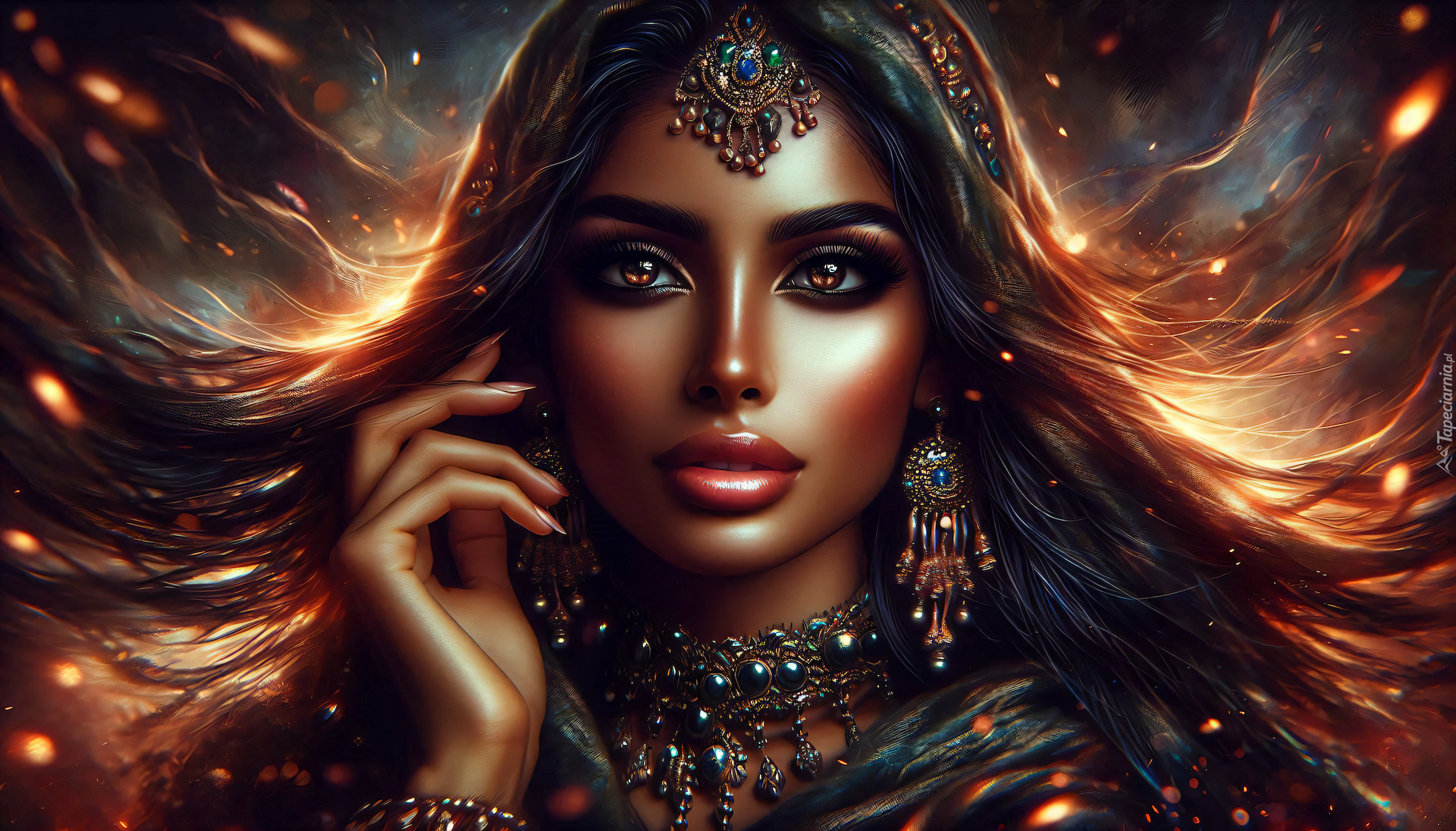 Edytor tapety: Długowłosa kobieta w makijażu i biżuterii