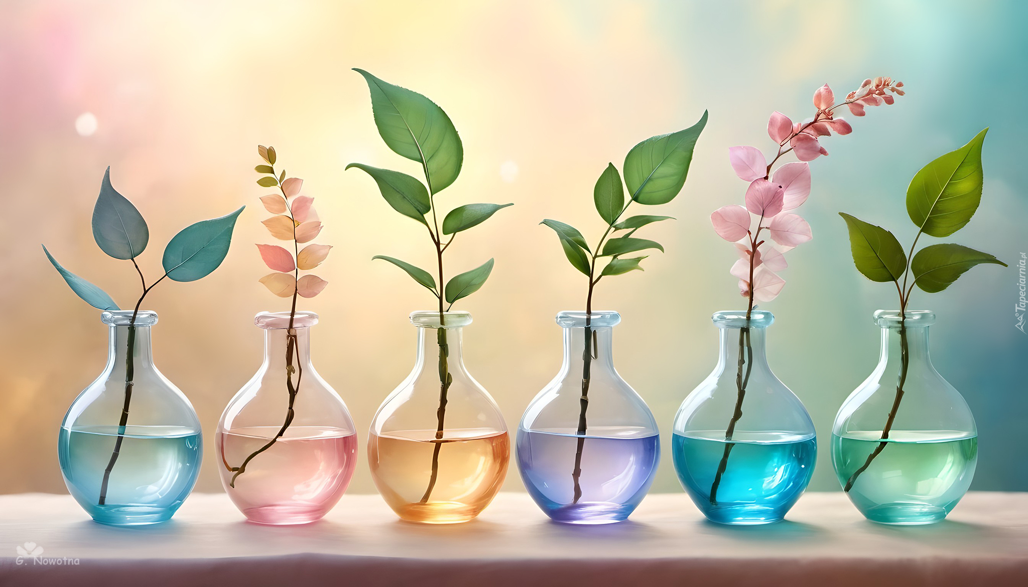 Edytor tapety: Gałązki z liśćmi w kolorowych wazonikach