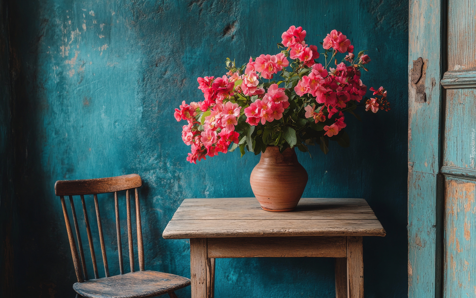 Edytor tapety: Kwiaty w wazonie na stole i krzesło obok