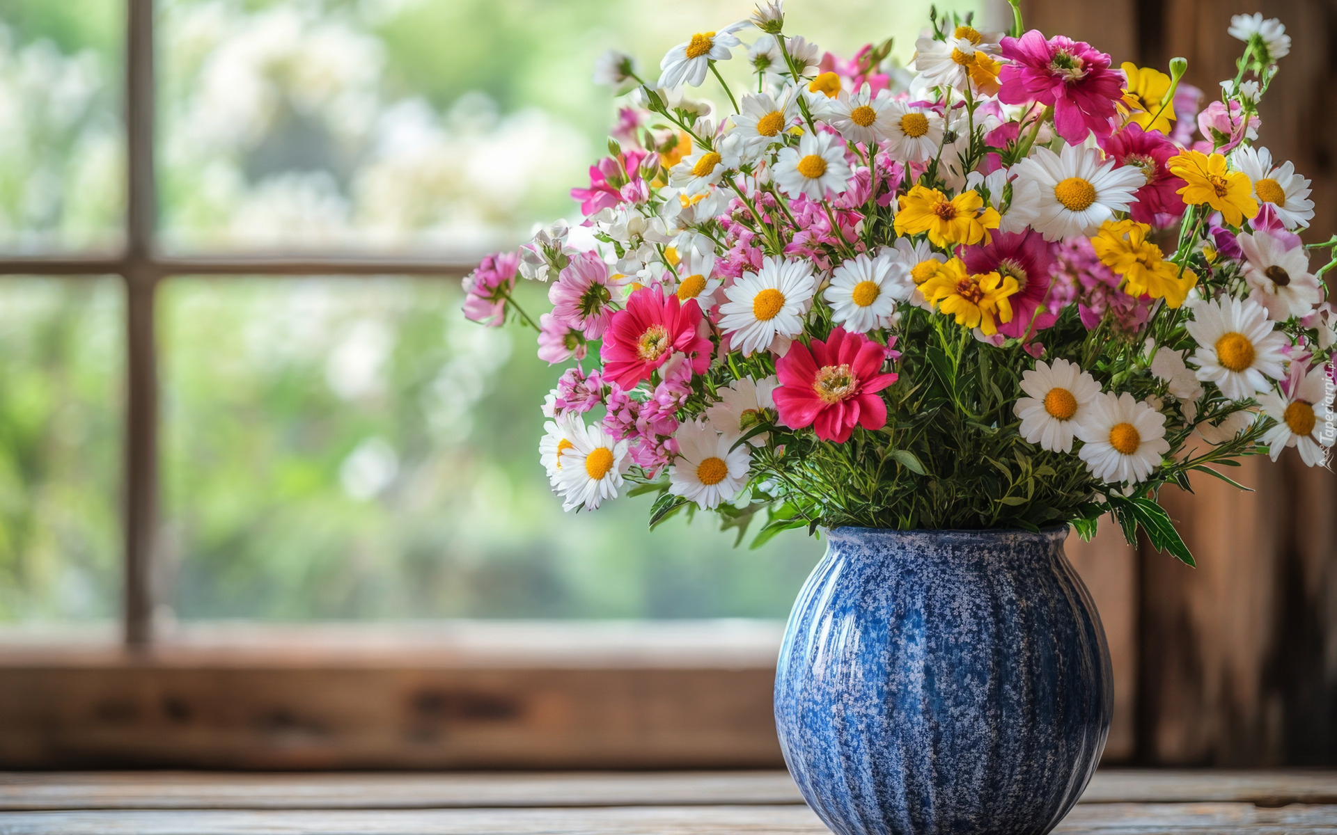 Edytor tapety: Bukiet polnych kwiatów w niebieskim wazonie przy oknie