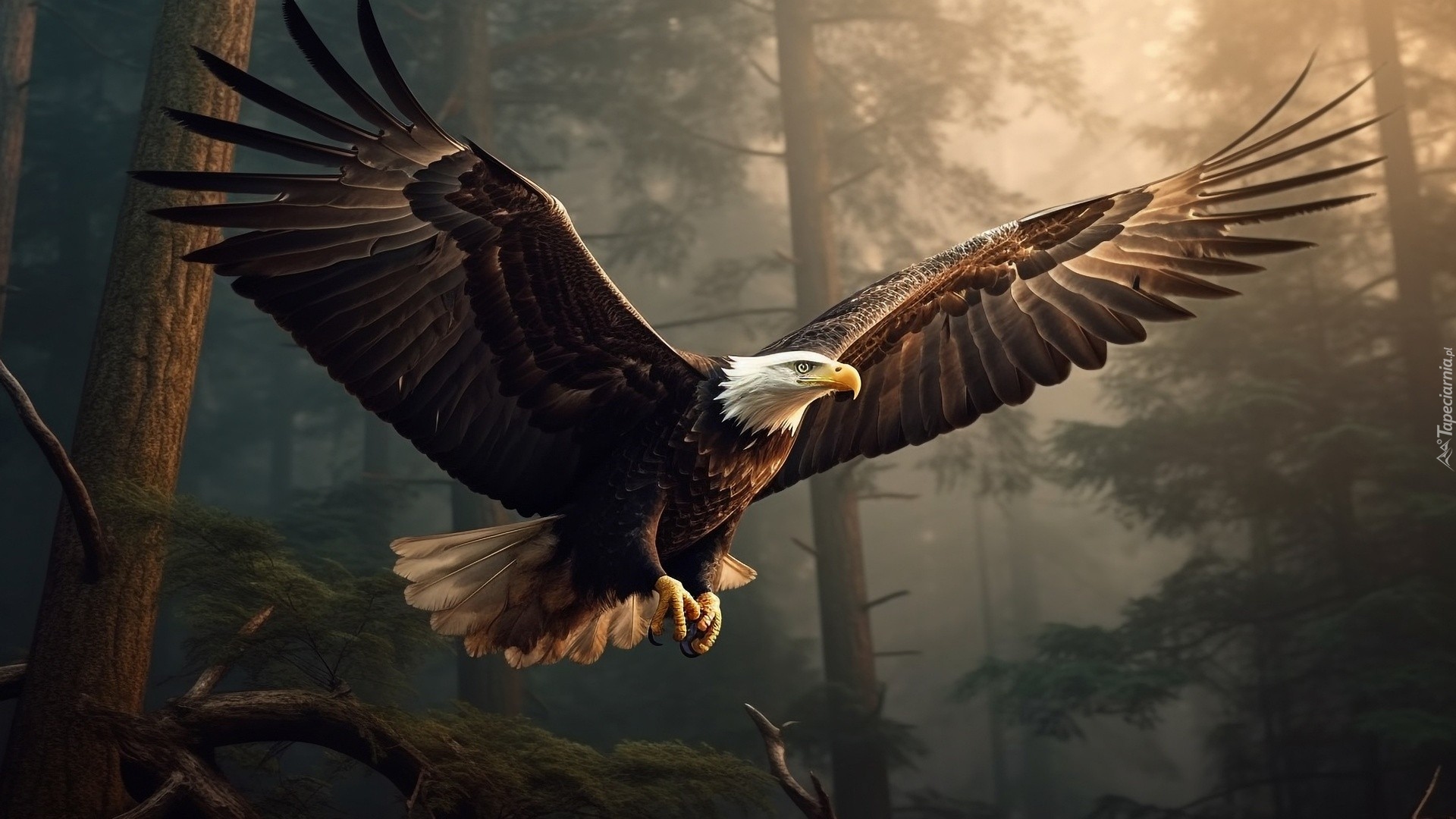 Edytor tapety: Bielik amerykański w locie między drzewami w lesie