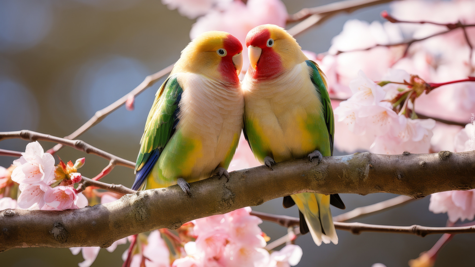 Edytor tapety: Dwie papużki nierozłączki na ukwieconej gałązce
