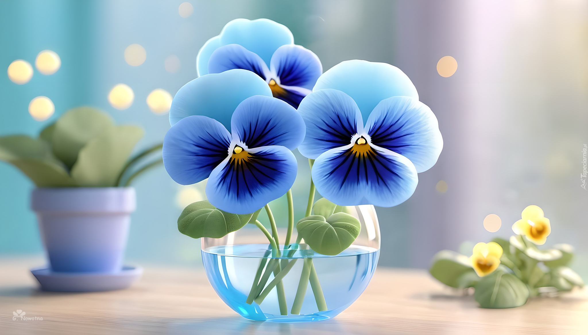 Edytor tapety: Trzy niebieskie bratki w szklanym naczyniu