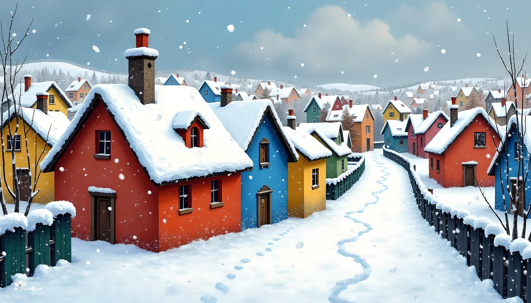 Edytor tapety: Ośnieżone kolorowe domy przy zaśnieżonej ulicy w grafice