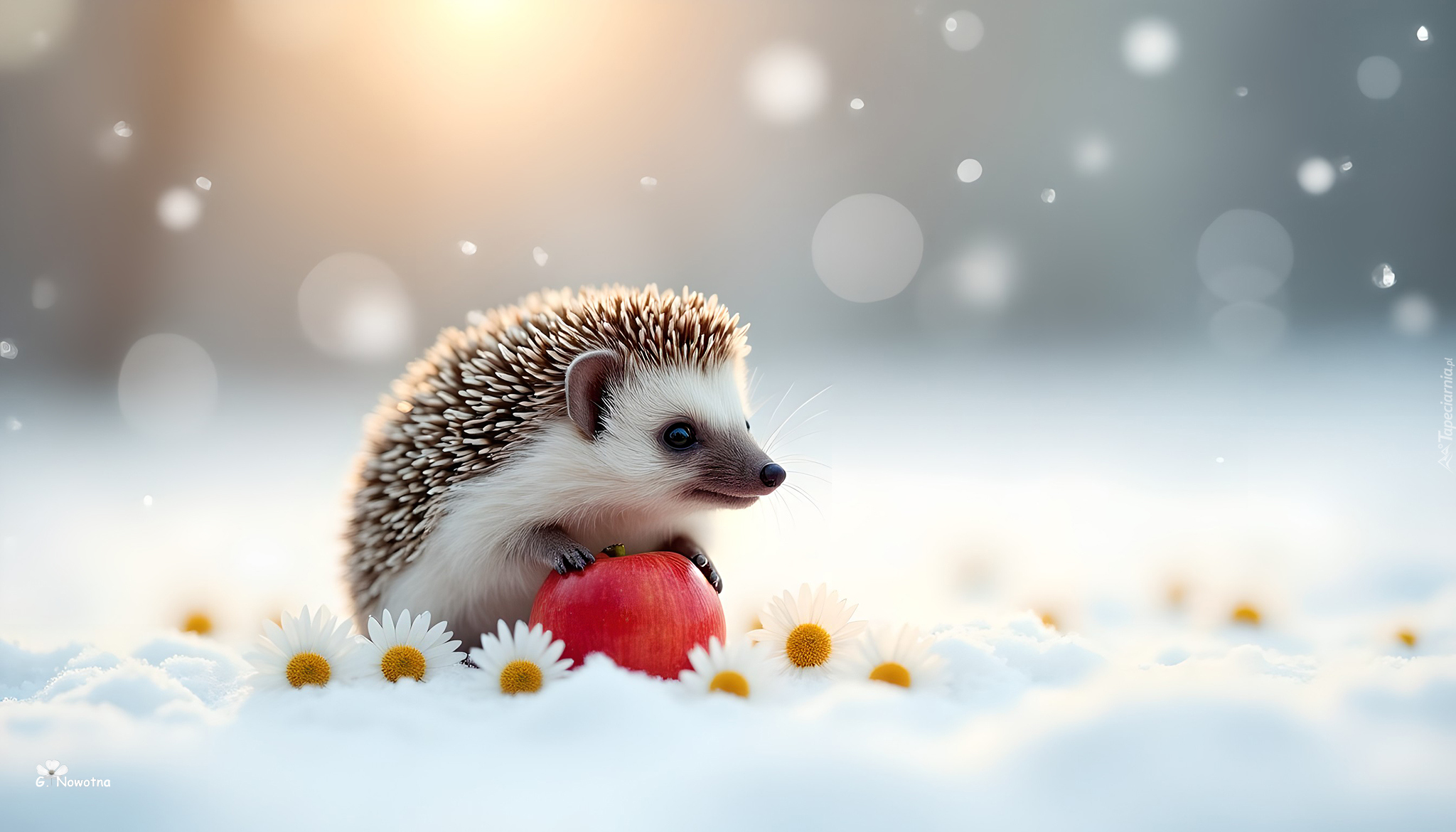 Edytor tapety: Białe kwiaty obok jeża z jabłkiem na śniegu