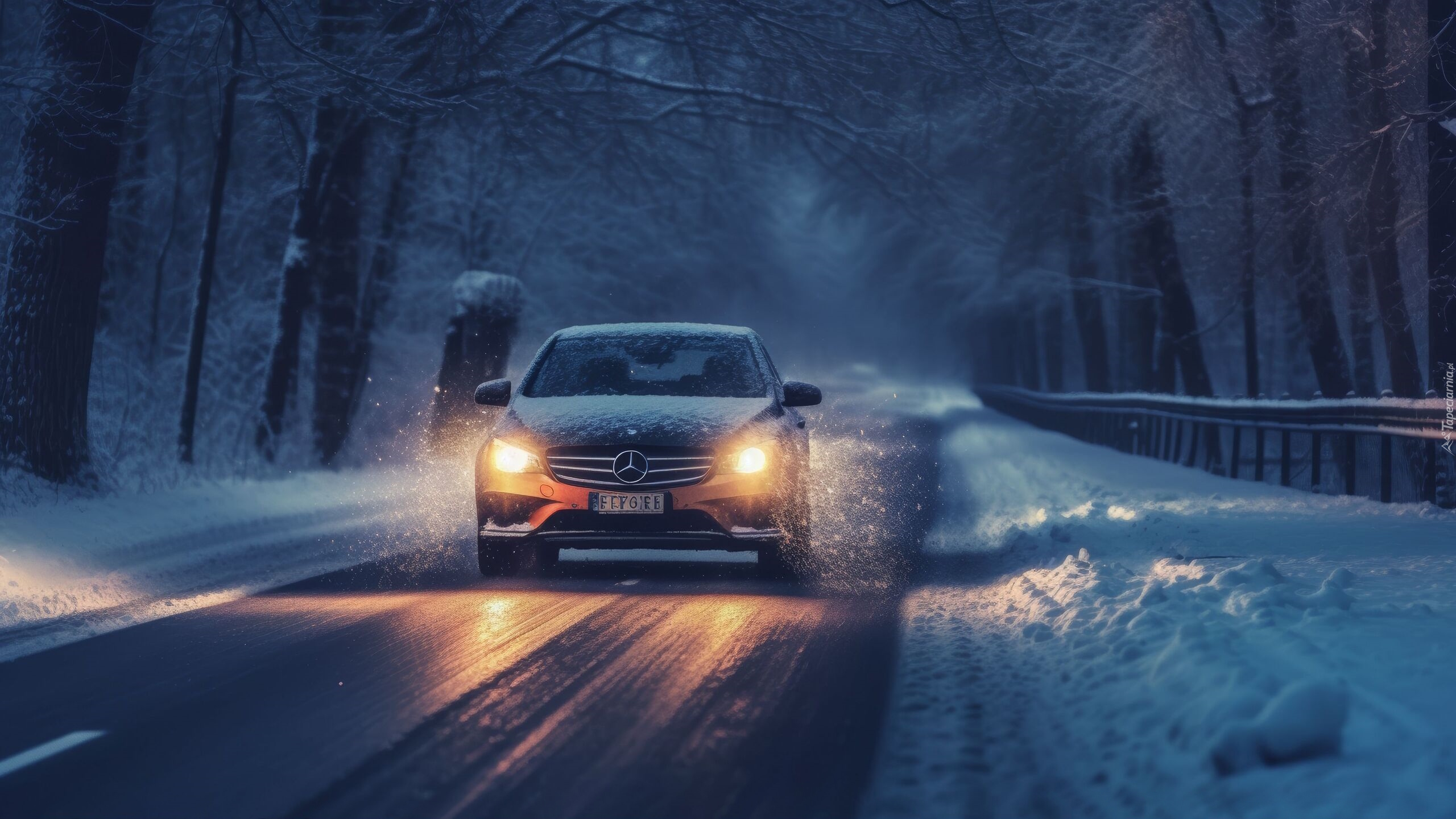 Edytor tapety: Mercedes na drodze w padającym śniegu
