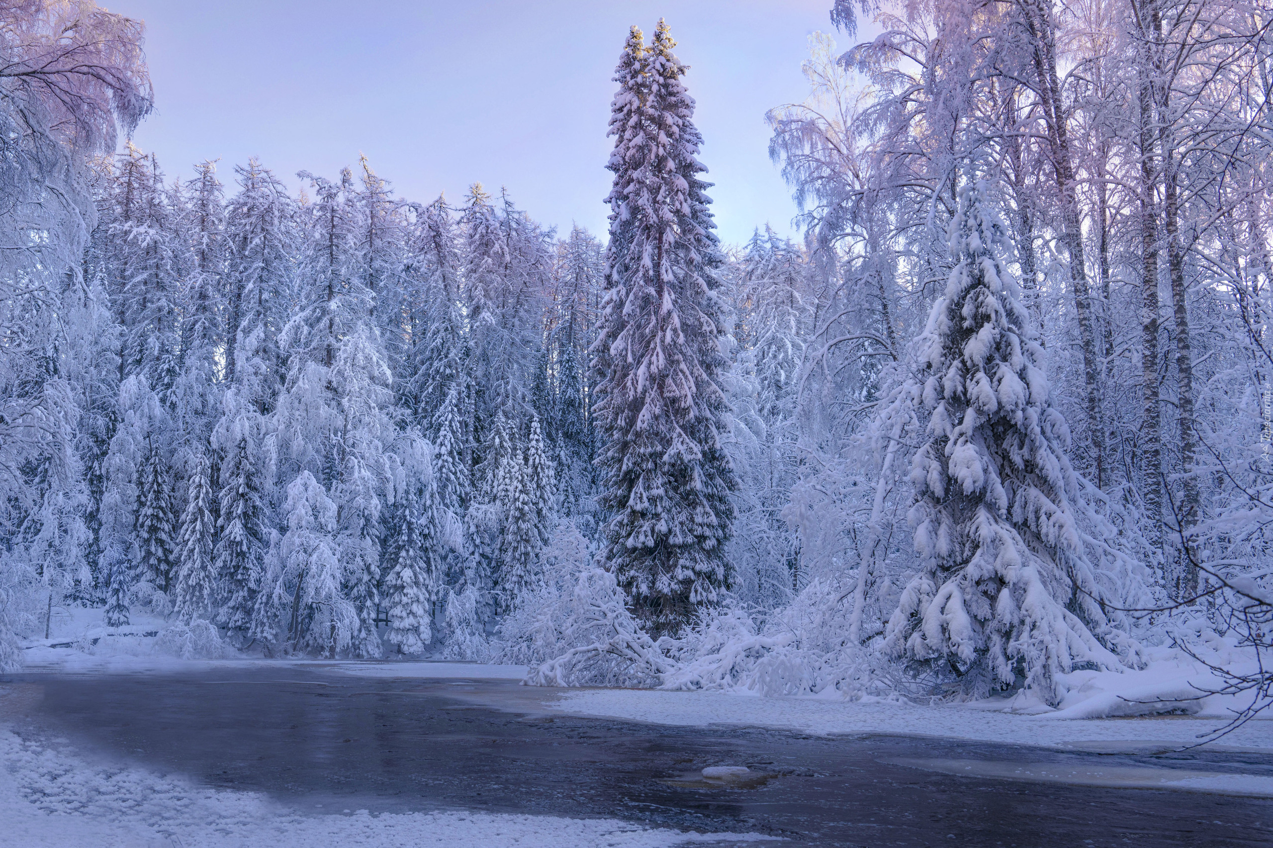 Edytor tapety: Ośnieżone drzewa nad rzeką zimą