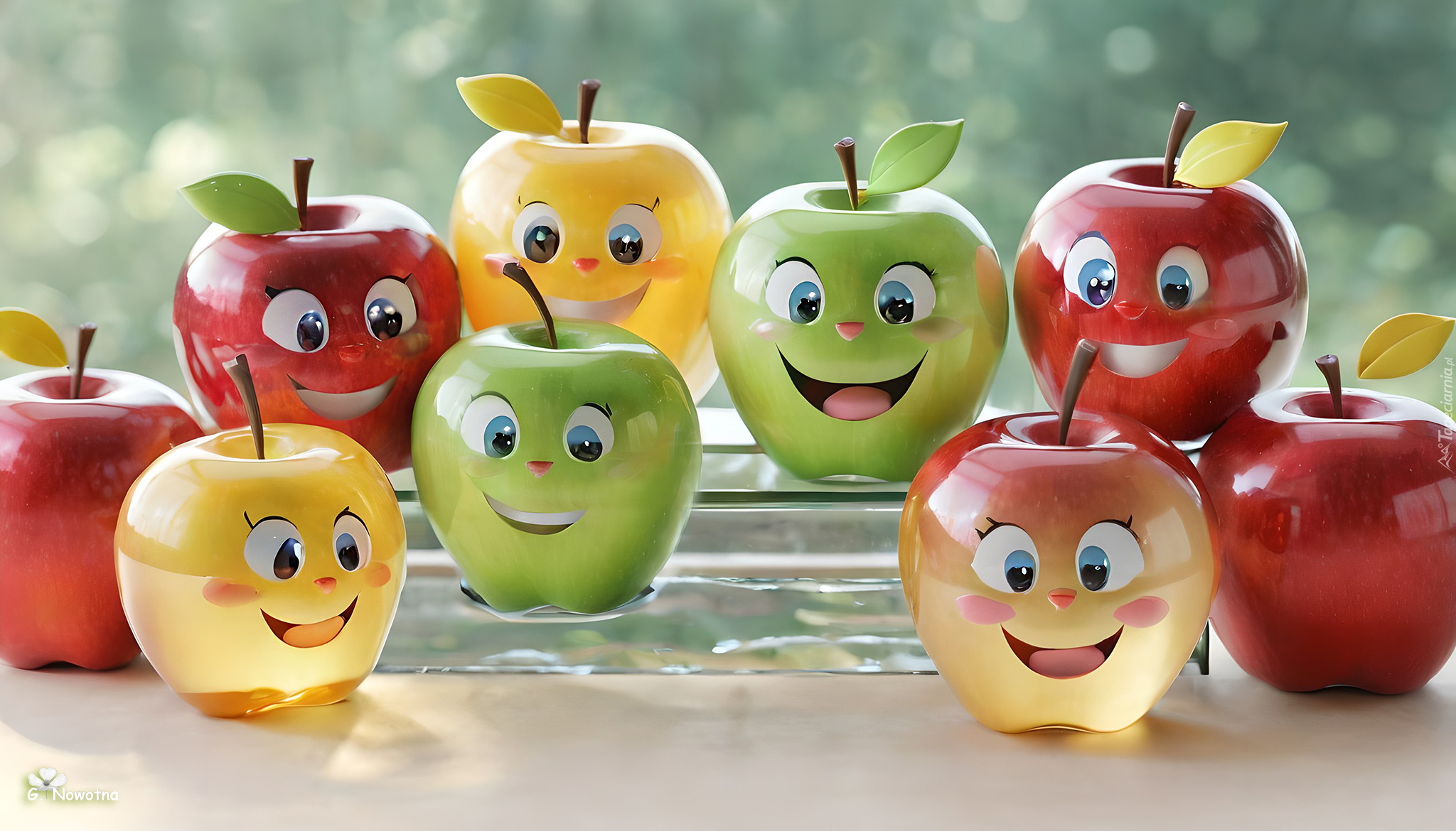 Edytor tapety: Uśmiechnięte kolorowe jabłka w grafice