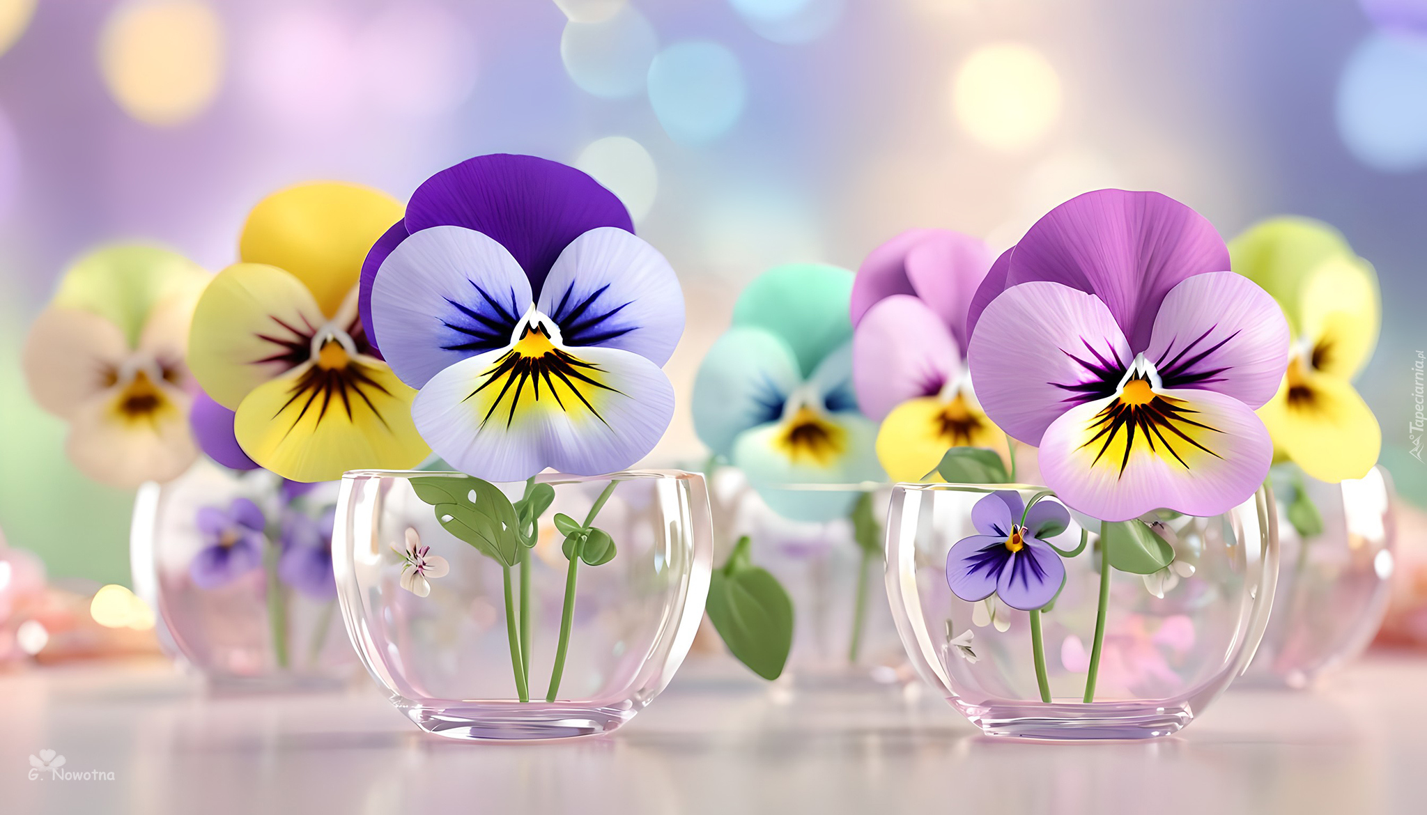 Edytor tapety: Kolorowe bratki w szklanych naczyniach