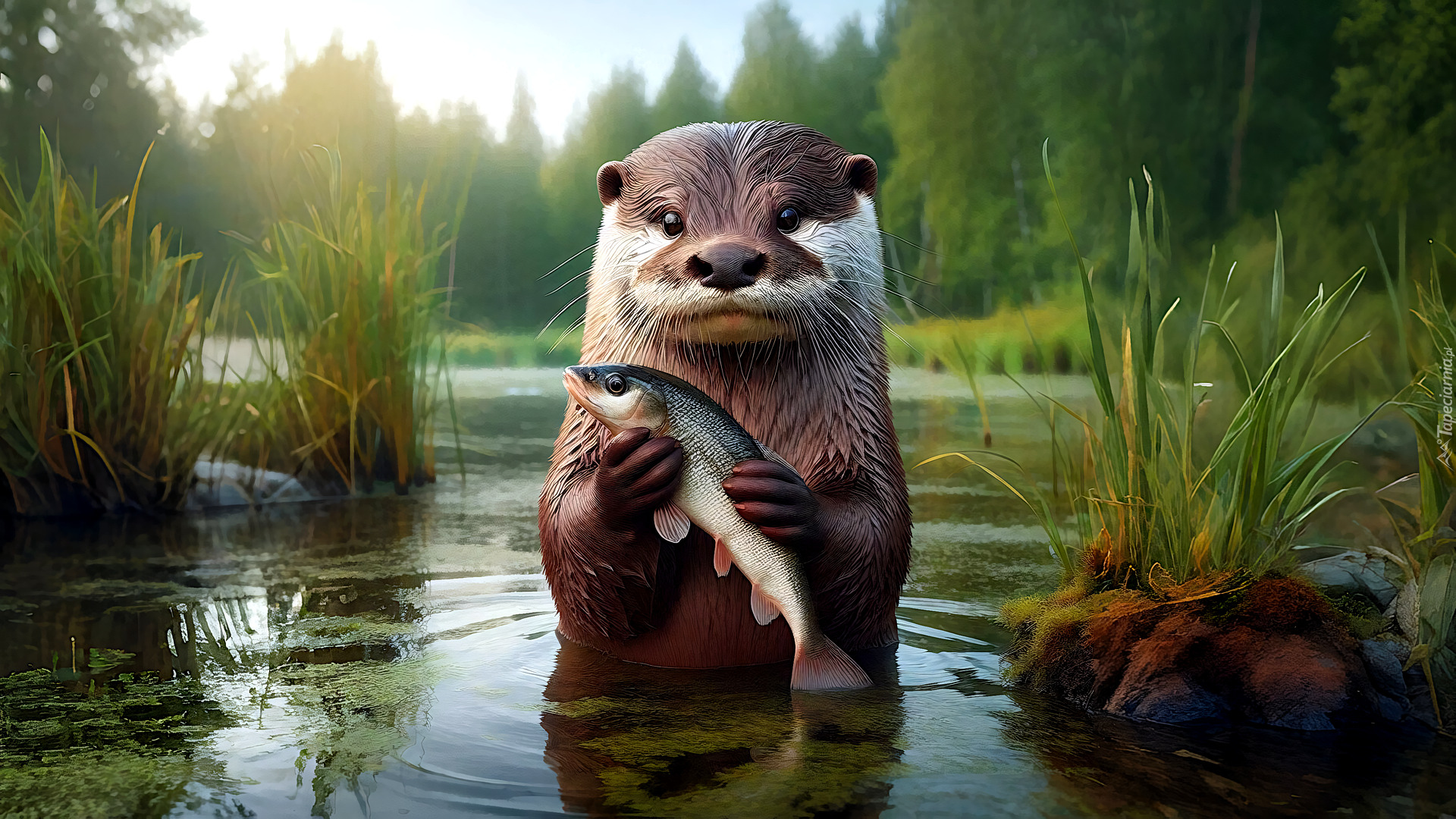 Edytor tapety: Wydra z rybą w wodzie w grafice