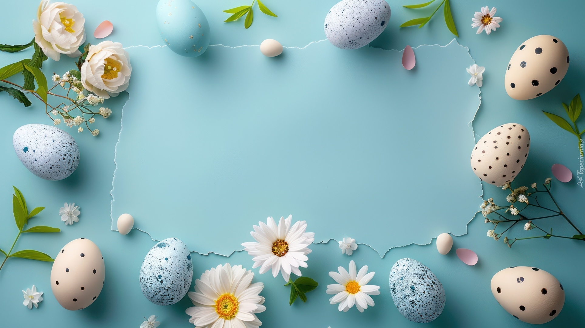 Edytor tapety: Kolorowe pisanki obok białych kwiatów na niebieskim tle