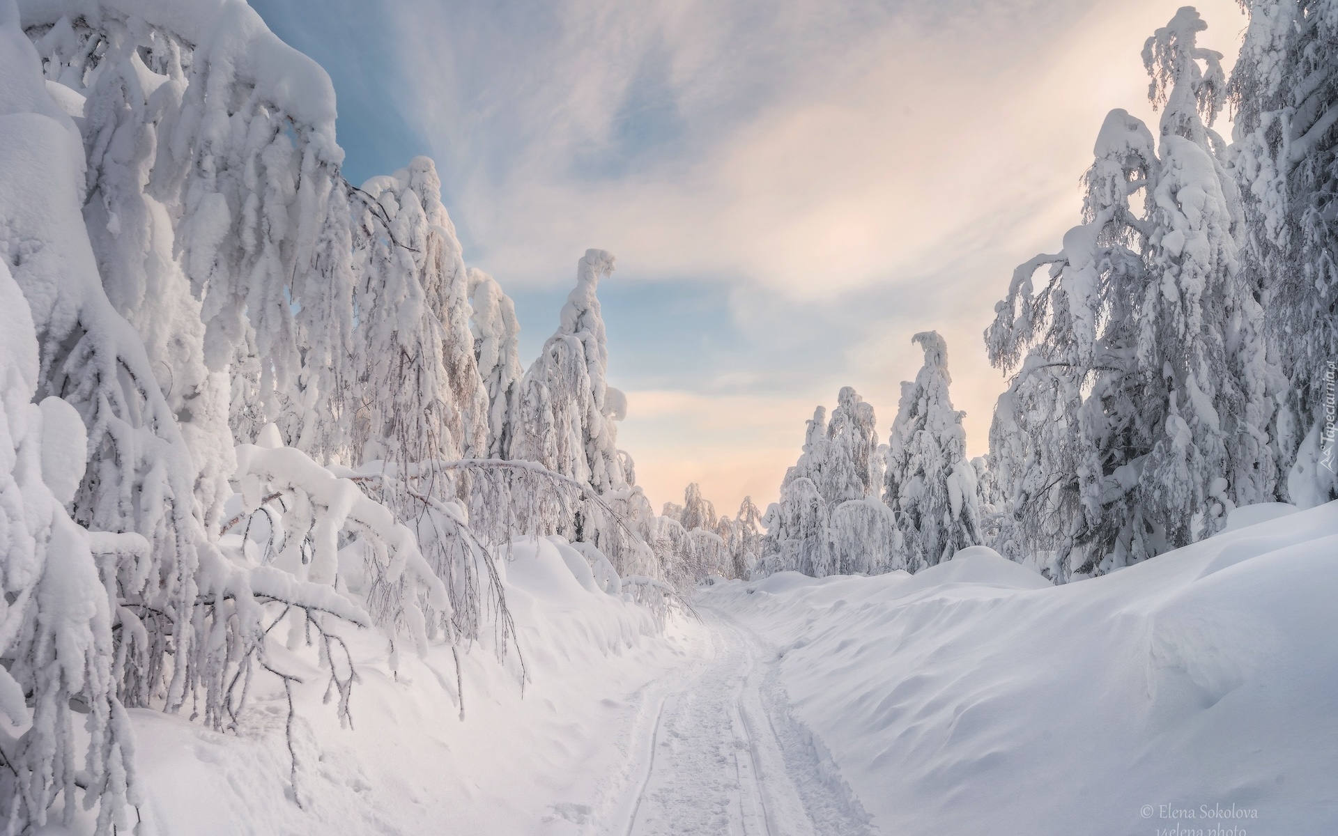 Edytor tapety: Zasypane śniegiem drzewa przy zaśnieżonej drodze w lesie
