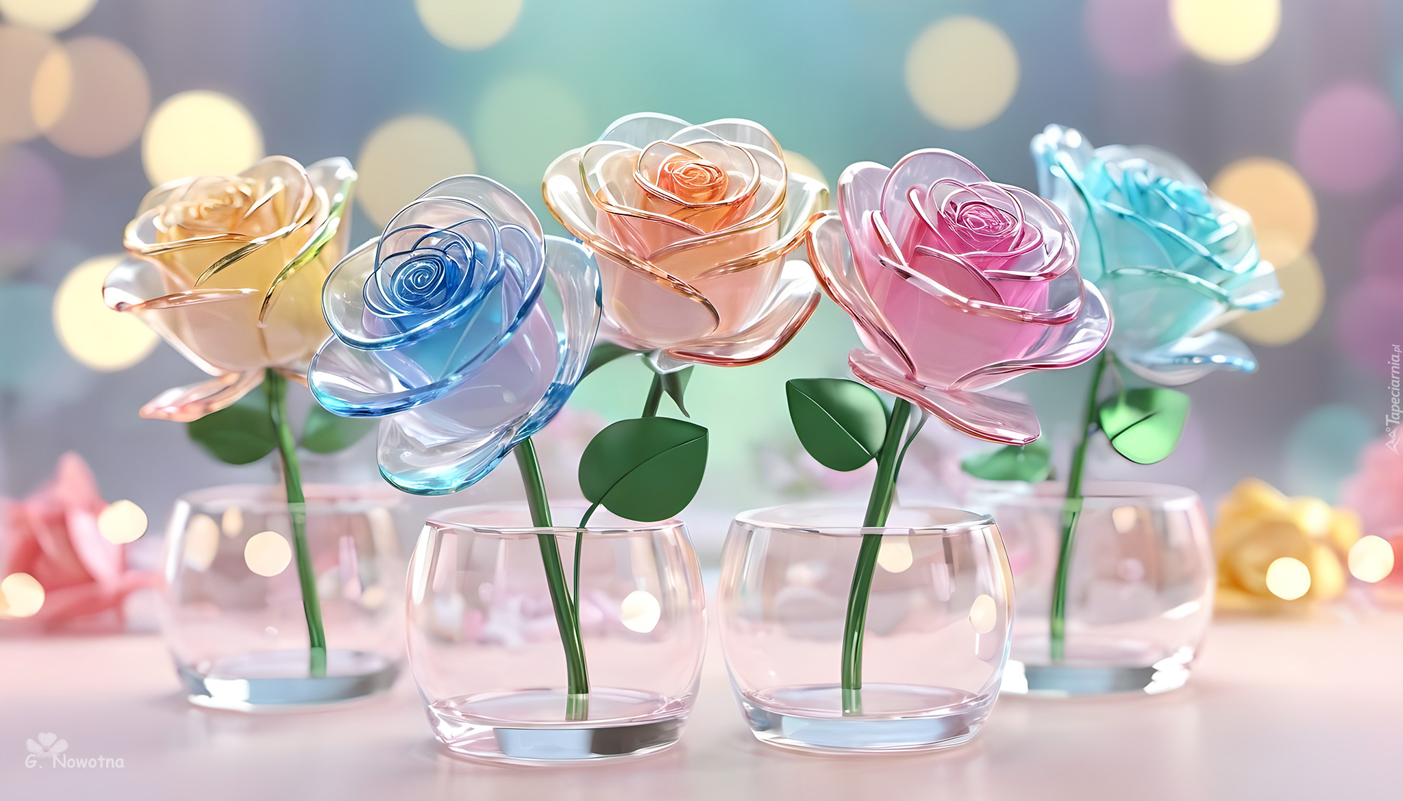 Edytor tapety: Szklane kolorowe róże w szklanych naczyniach
