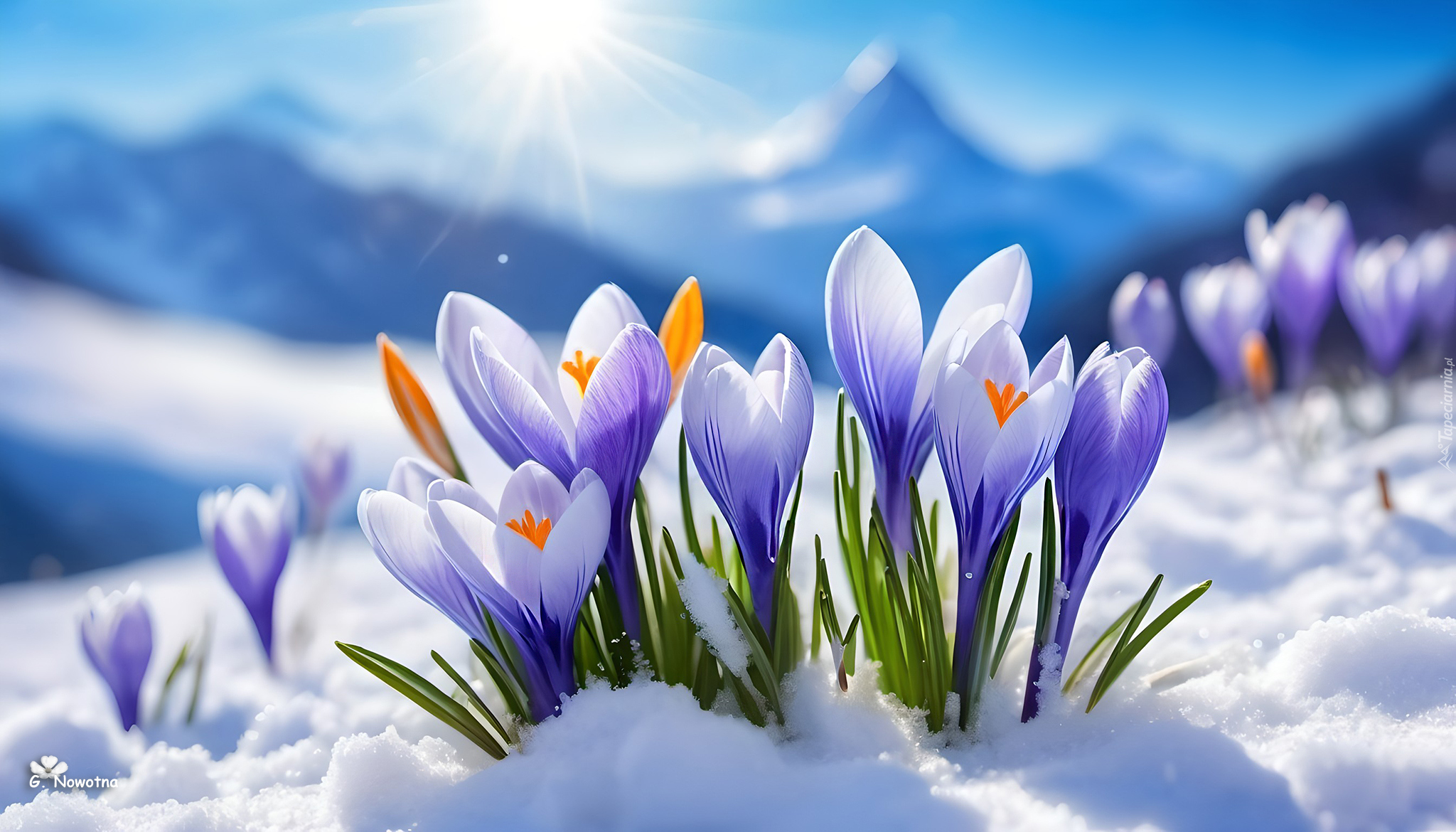 Edytor tapety: Rozświetlone słonecznymi promieniami krokusy w śniegu