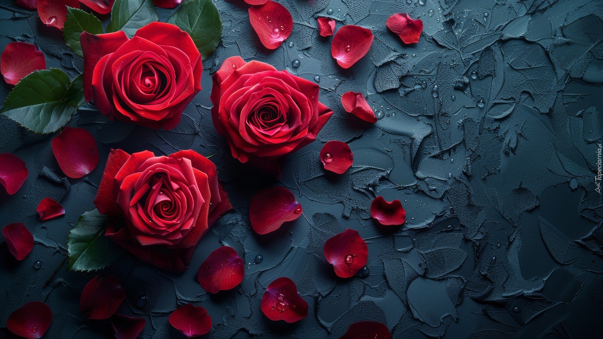 Edytor tapety: Płatki obok trzech rozkwitniętych czerwonych róż