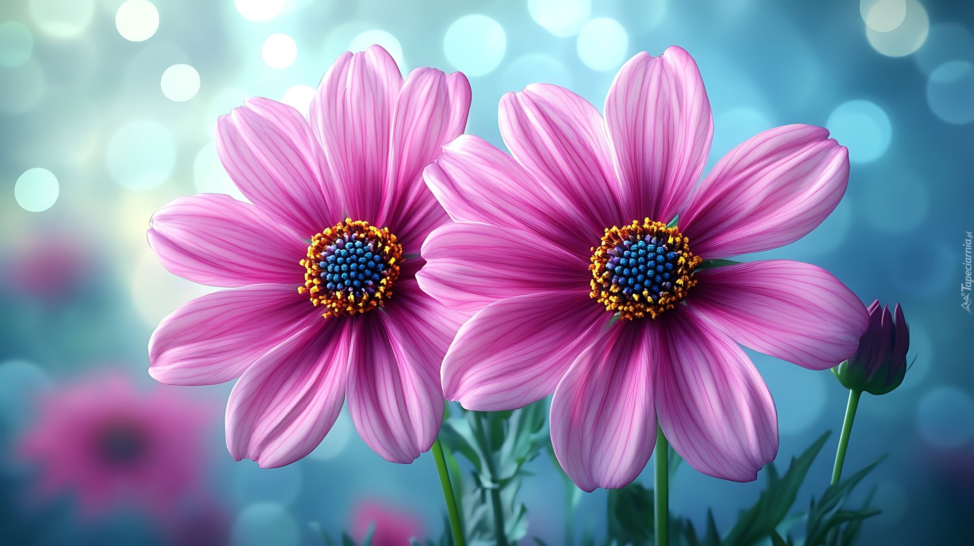 Edytor tapety: Dwie różowe stokrotki afrykańskie na rozmytym niebieskim tle
