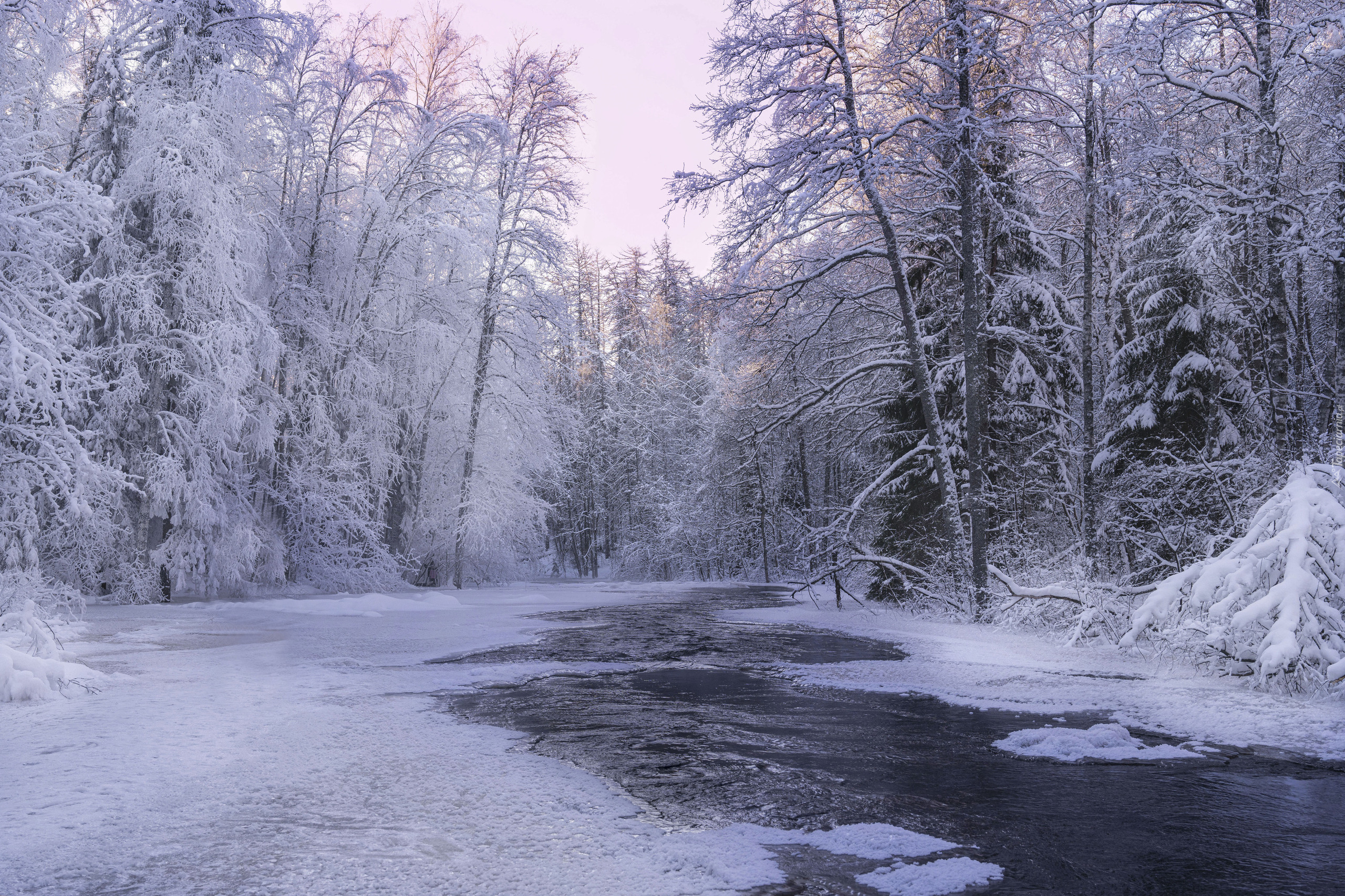 Edytor tapety: Ośnieżone wysokie drzewa po obu stronach rzeki