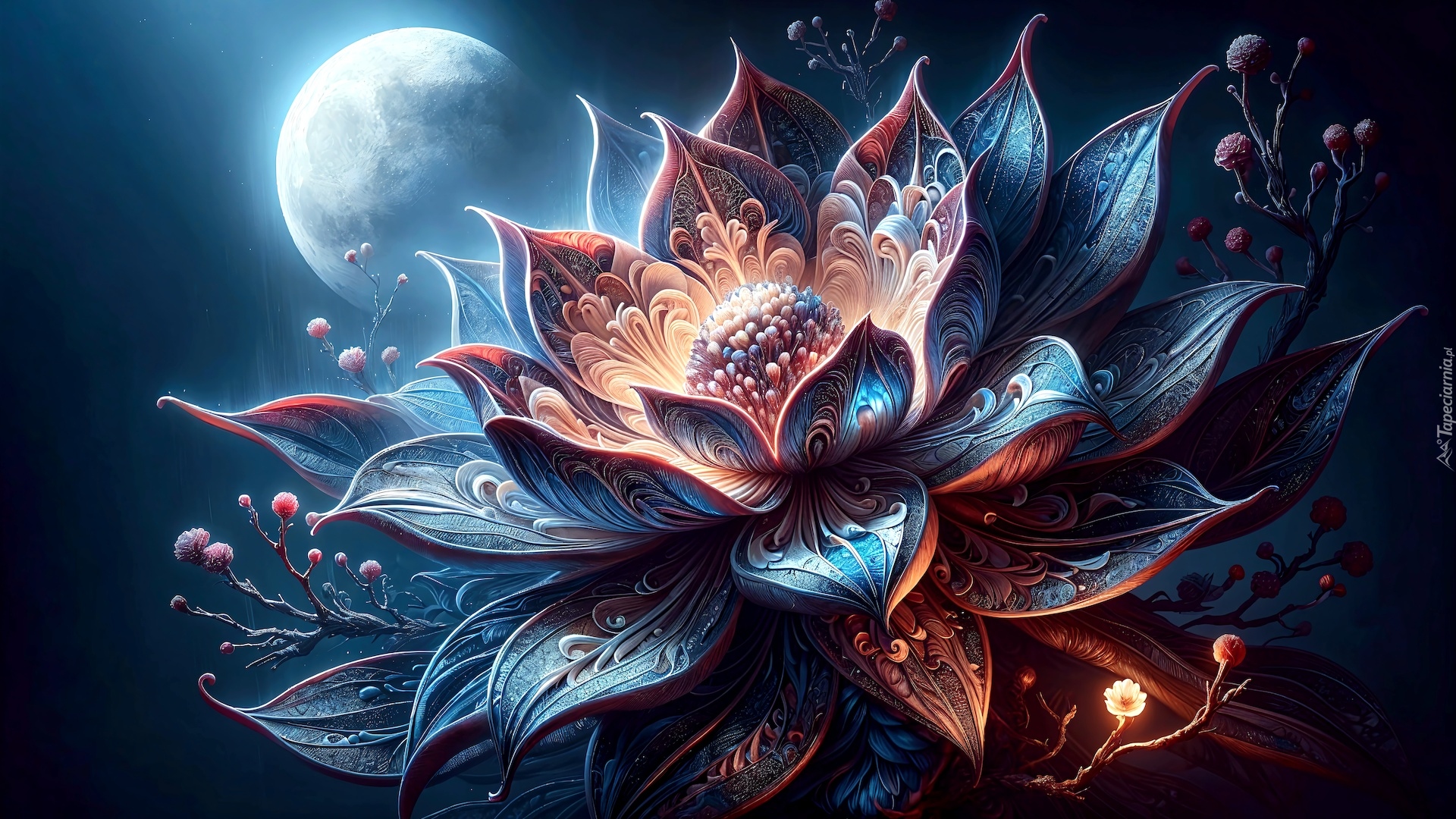 Edytor tapety: Rozkwitnięty kolorowy kwiat w księżycowym blasku