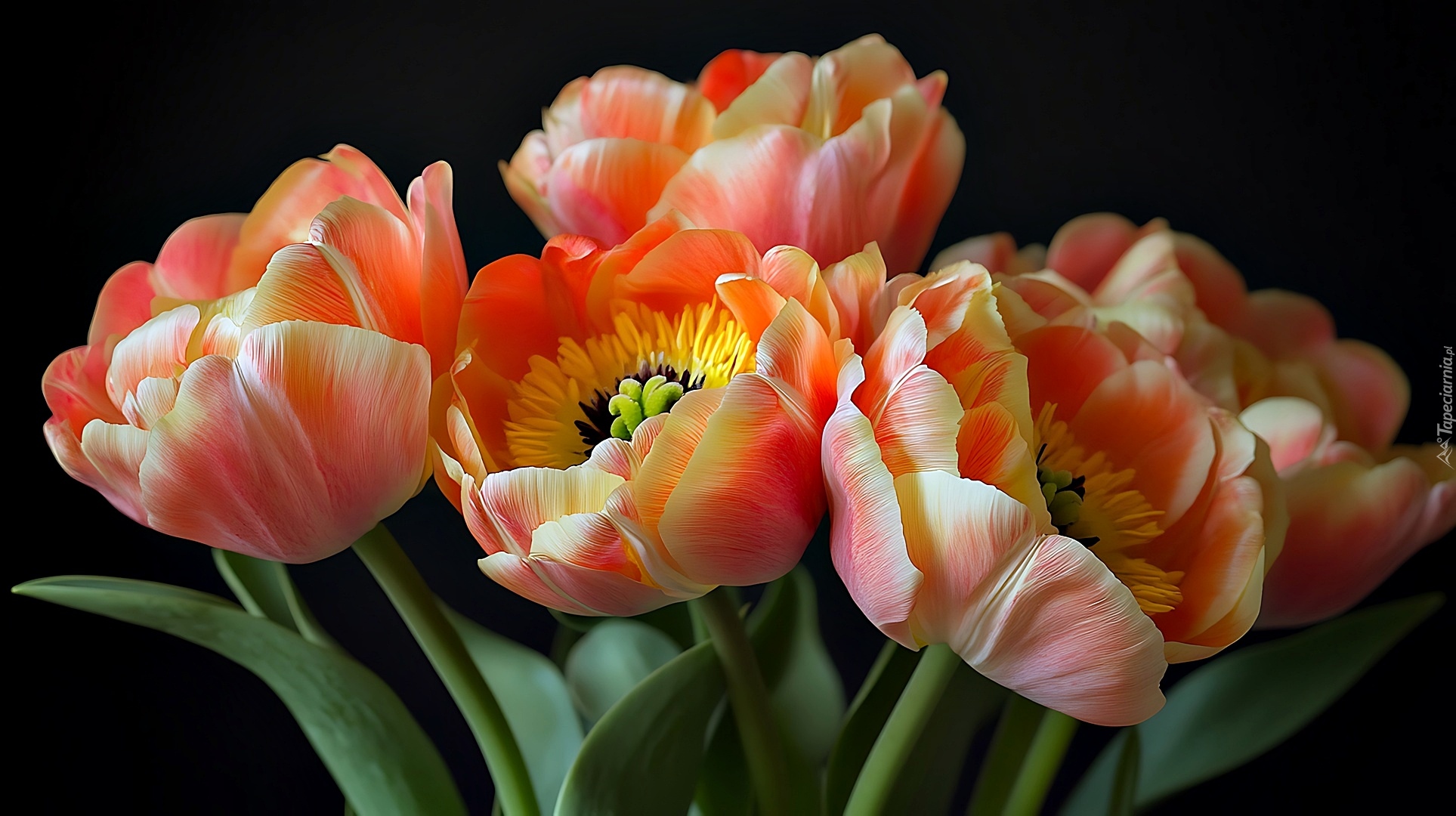 Edytor tapety: Rozwinięte dwukolorowe tulipany na czarnym tle