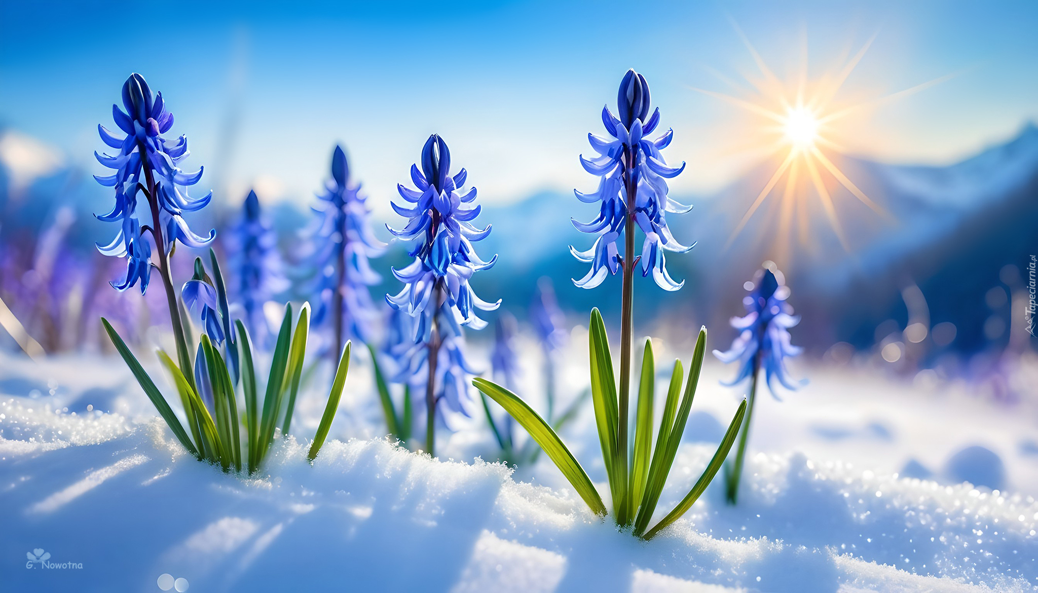 Edytor tapety: Niebieskie kwiaty na śniegu w promieniach słońca