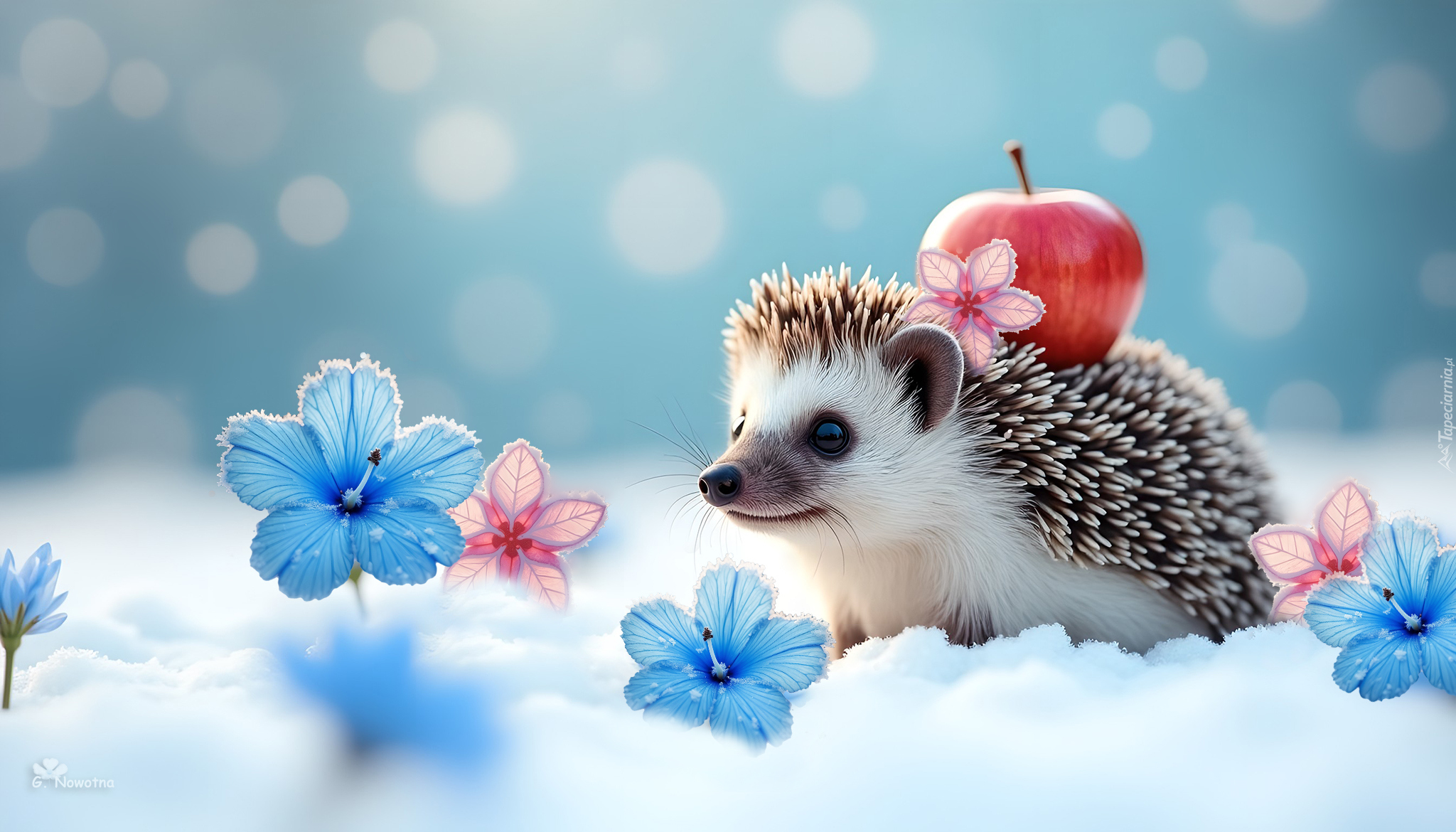Edytor tapety: Jeż z jabłkiem i kolorowe kwiaty w śniegu