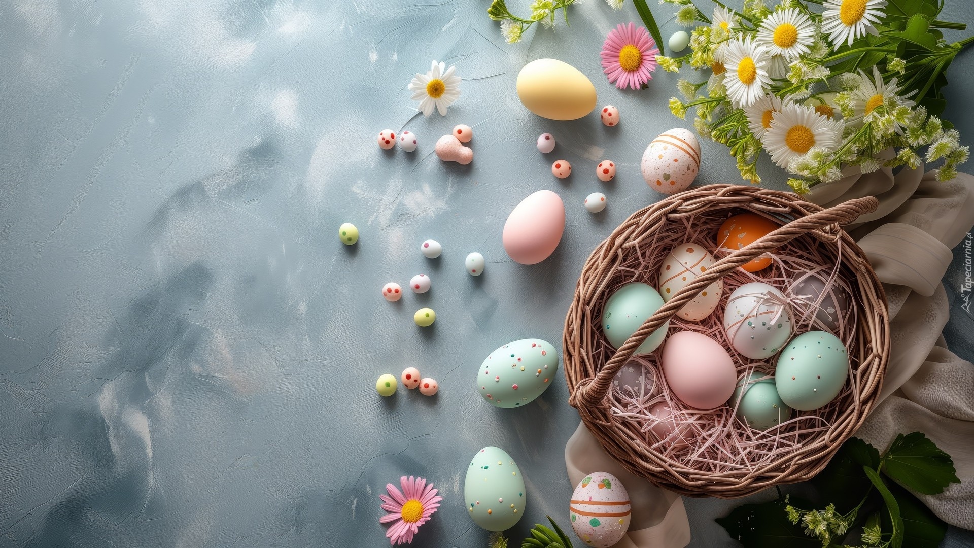Edytor tapety: Pisanki w koszyczku i obok przy białych kwiatach
