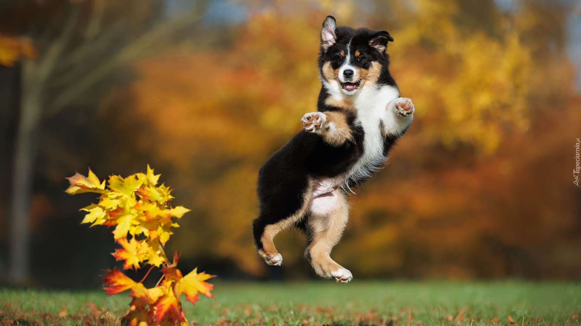 Edytor tapety: Skaczący szczeniak owczarka australijskiego