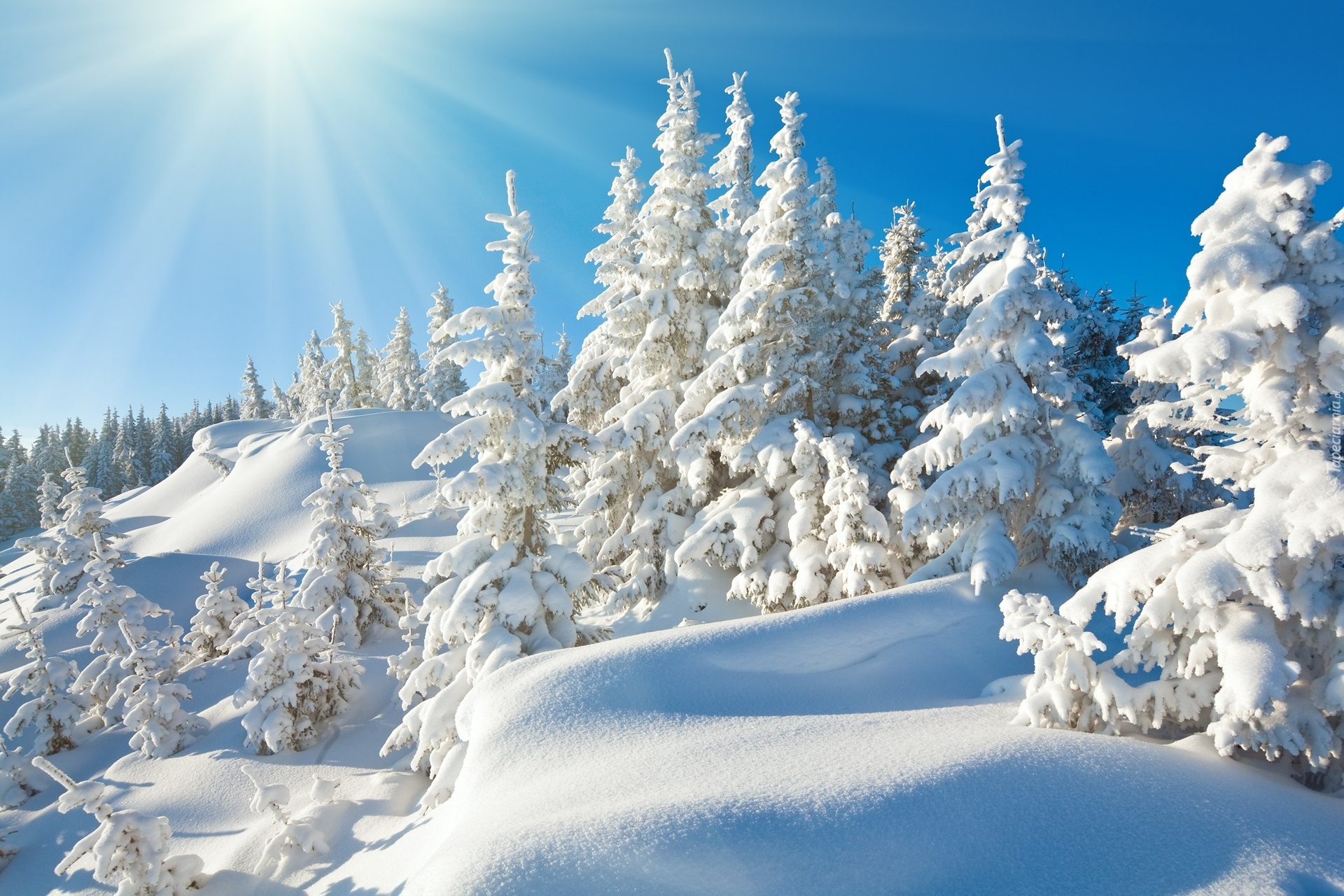 Edytor tapety: Rozświetlone słońcem ośnieżone drzewa w pogodny dzień
