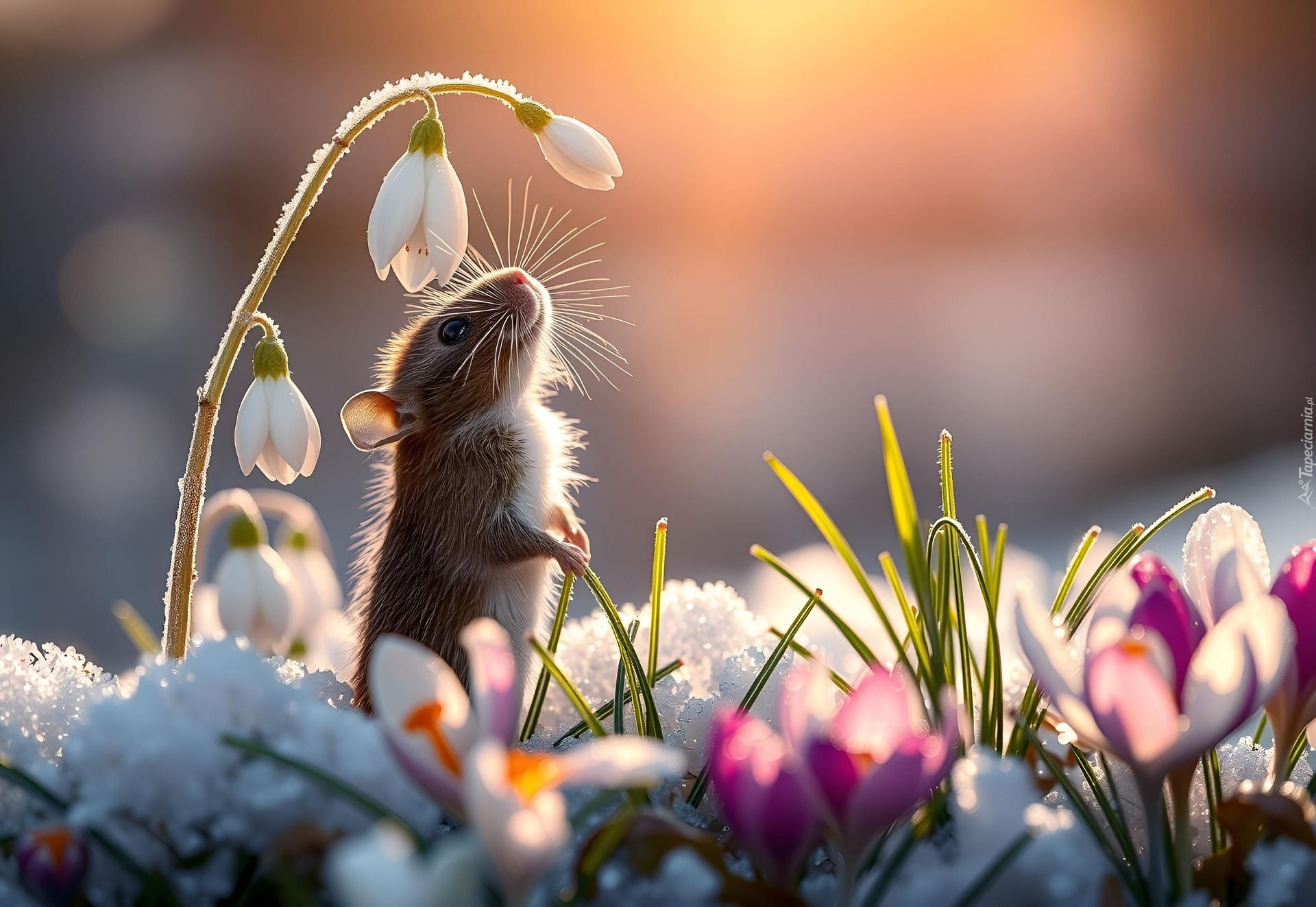 Edytor tapety: Myszka i kwiaty w śniegu w słonecznym blasku
