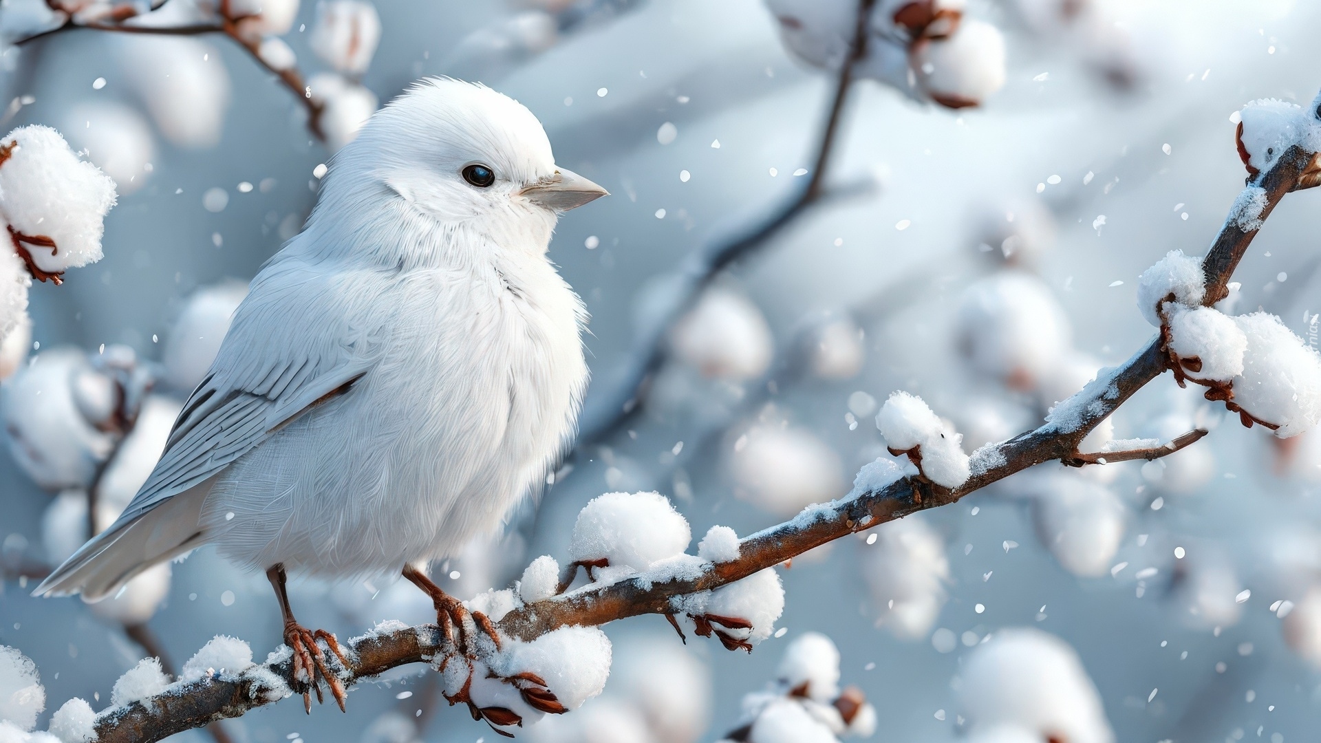 Edytor tapety: Biały ptak na ośnieżonej gałązce