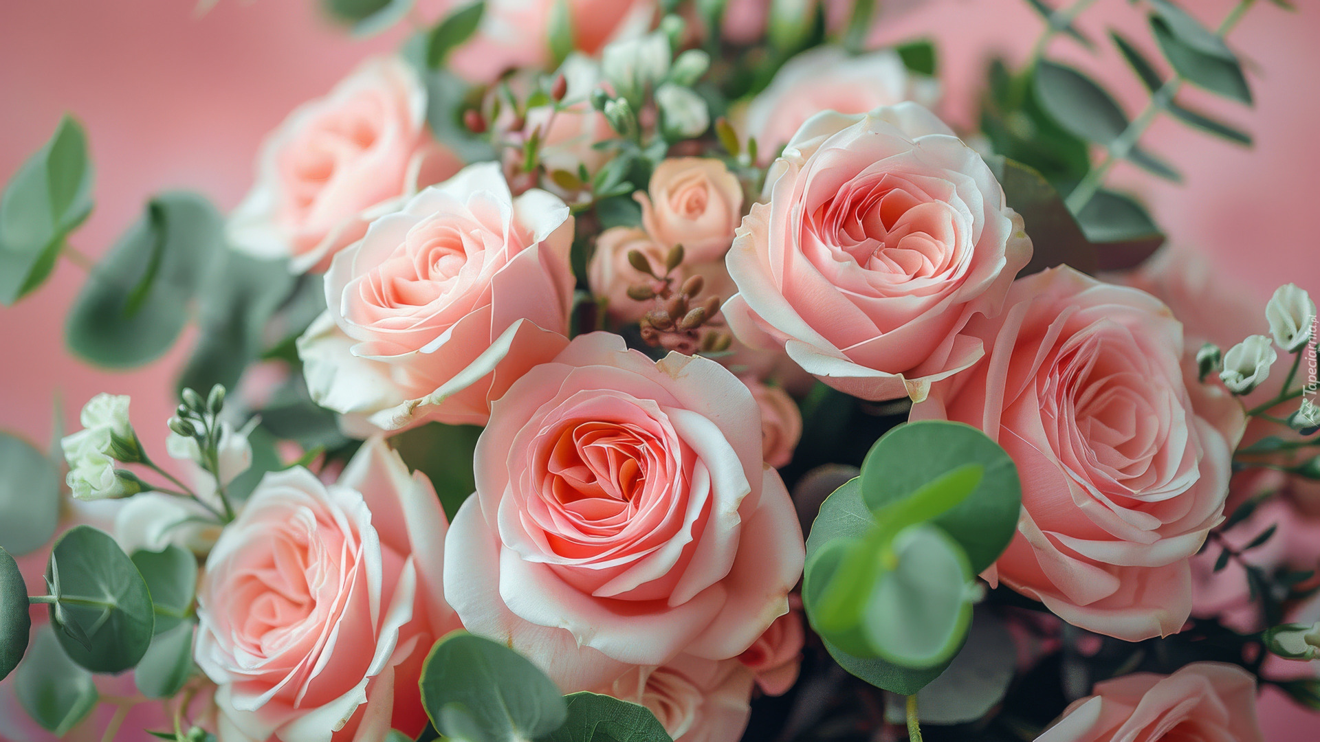 Edytor tapety: Różowe róże i liście w zbliżeniu