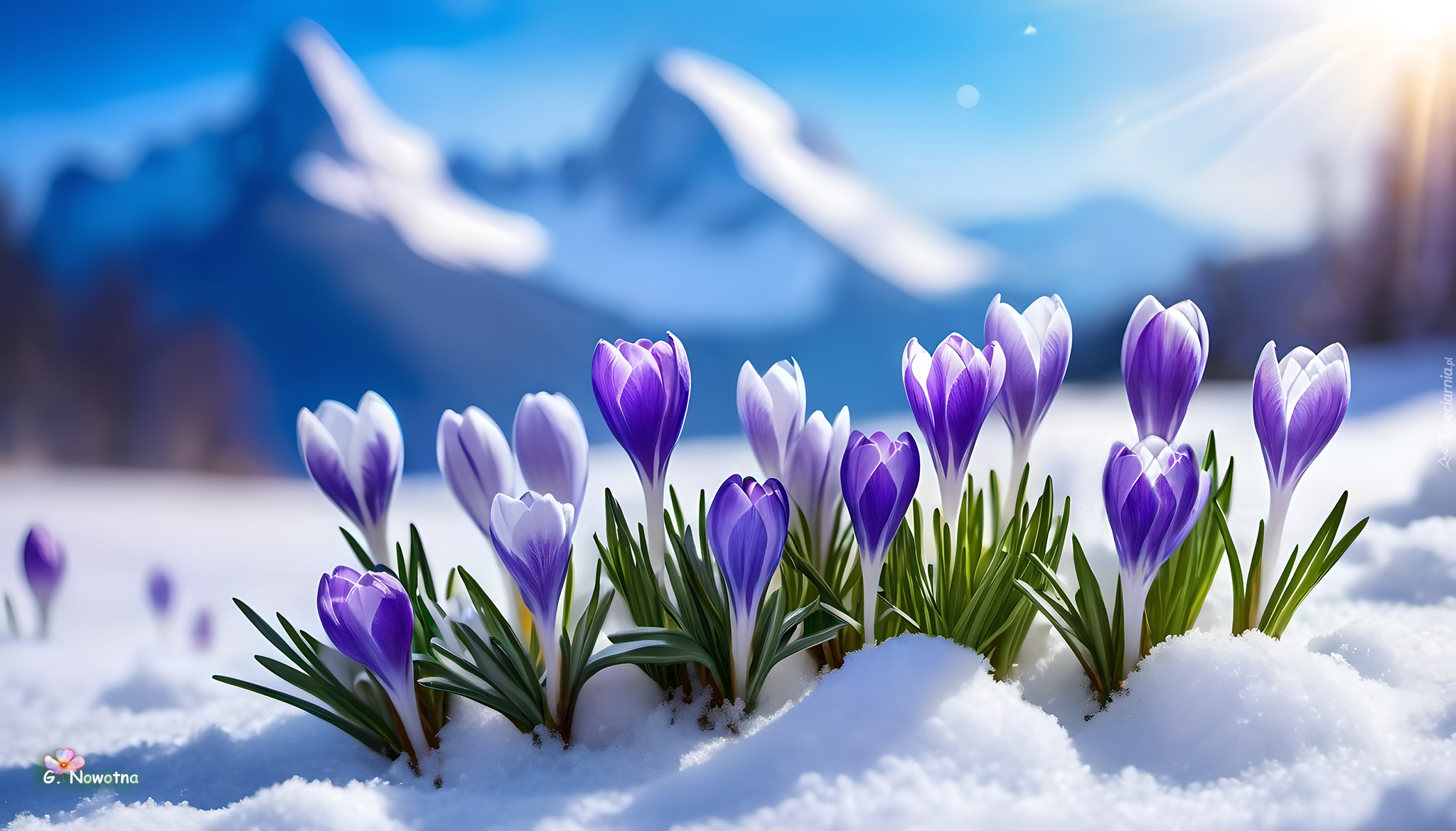 Edytor tapety: Kępka fioletowych krokusów w śniegu