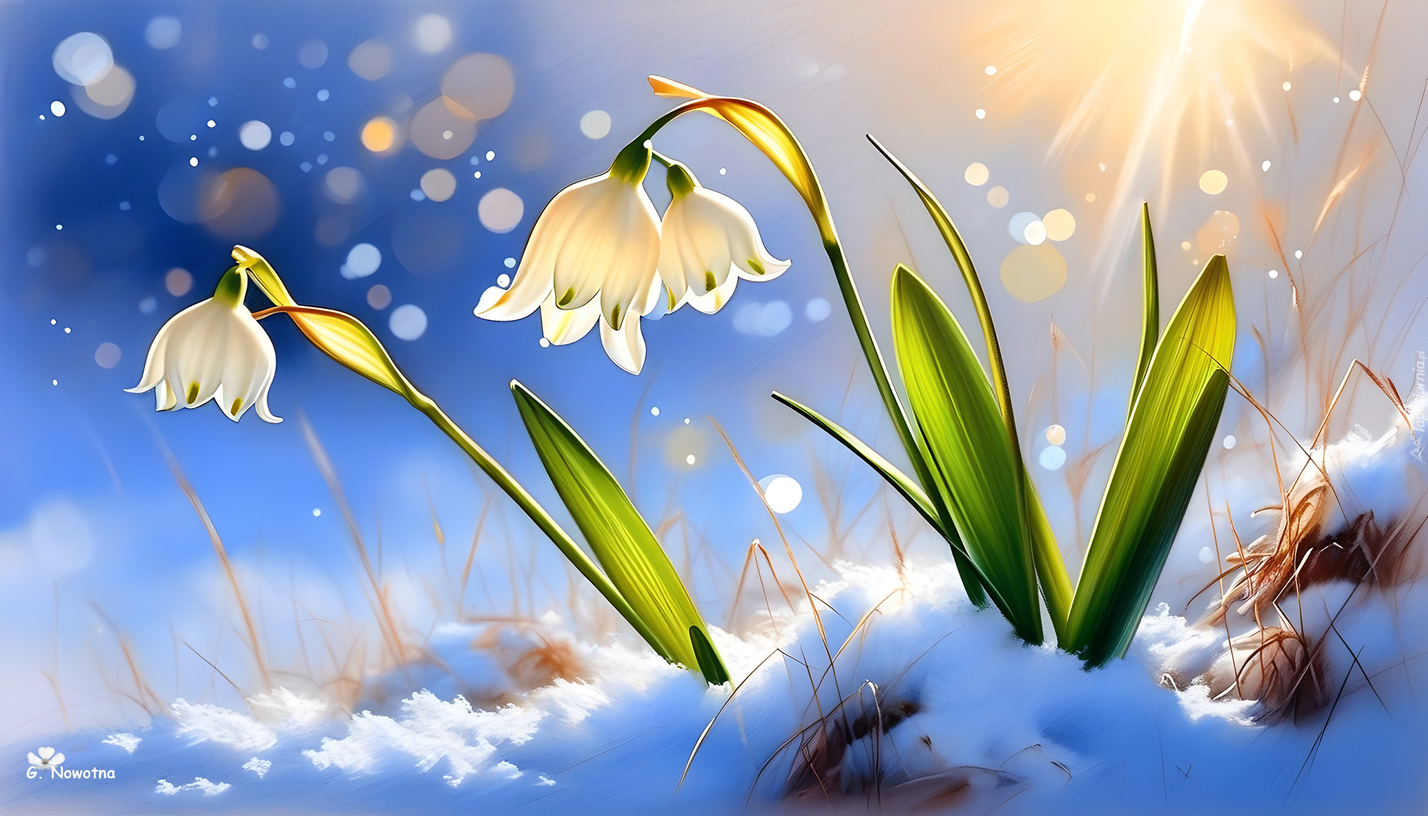 Edytor tapety: Rozświetlone promieniami słońca pochylone białe śnieżyce w śniegu