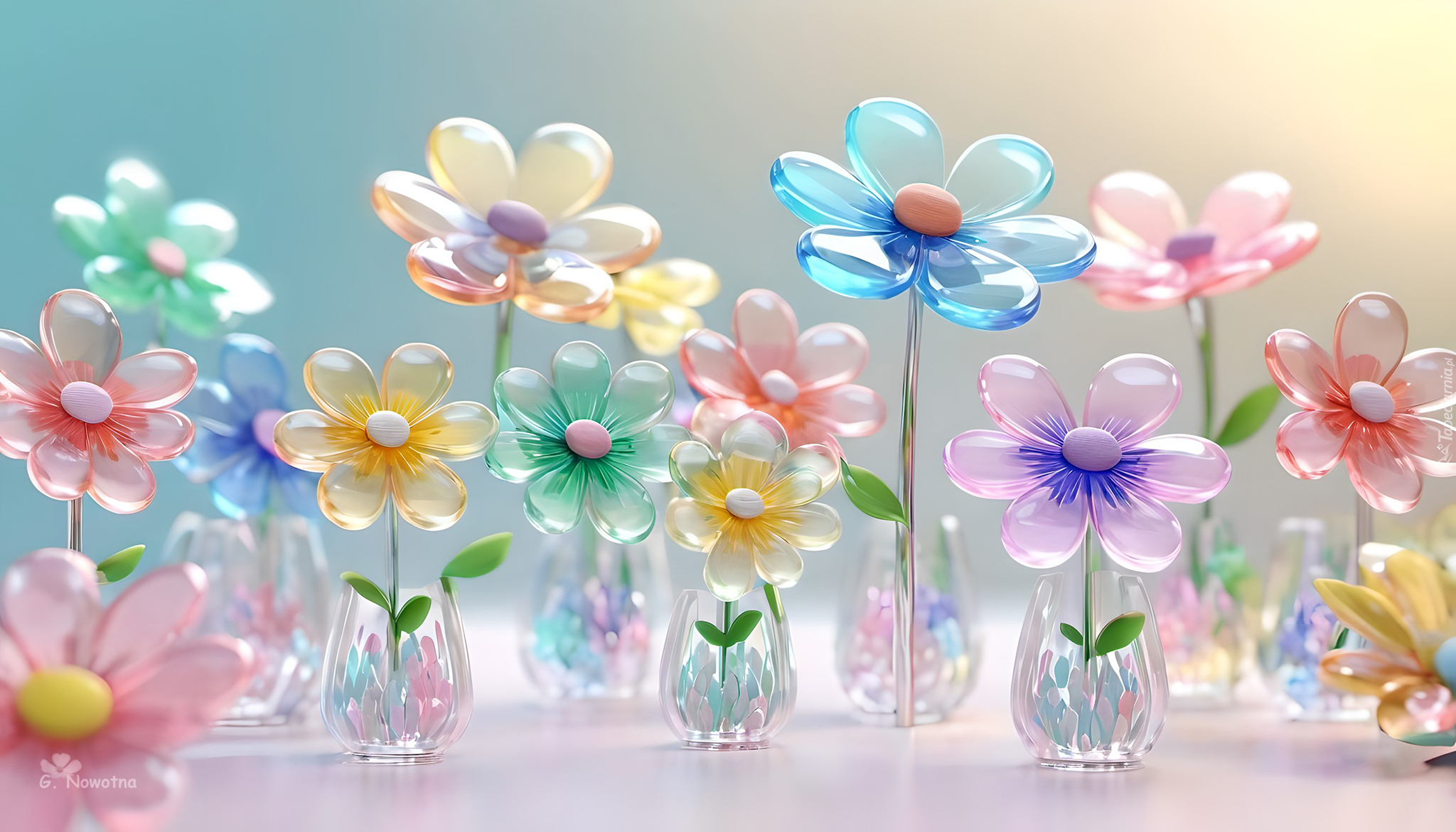 Edytor tapety: Kolorowe szklane kwiaty w wazonikach