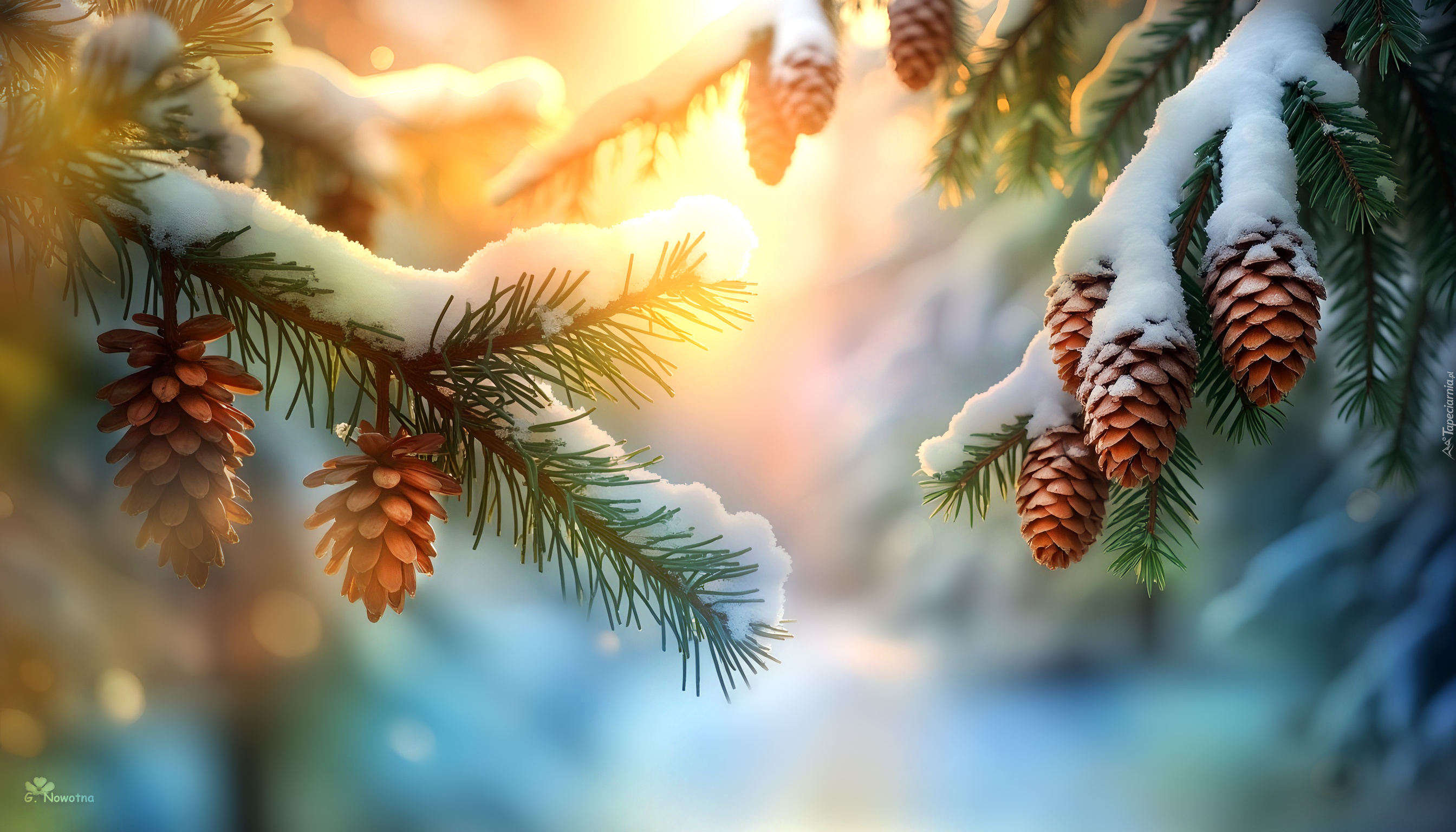 Edytor tapety: Ośnieżone szyszki i gałązki świerkowe w blasku światła