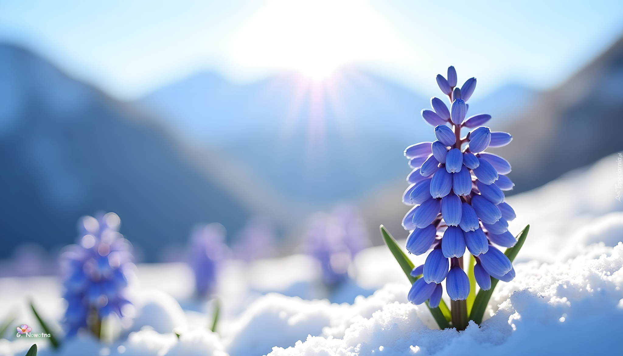 Edytor tapety: Rozświetlony słonecznym blaskiem niebieski szafirek w śniegu
