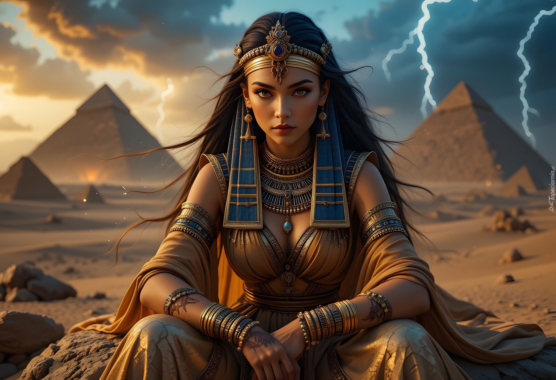 Edytor tapety: Egipcjanka siedząca na tle piorunów nad piramidami
