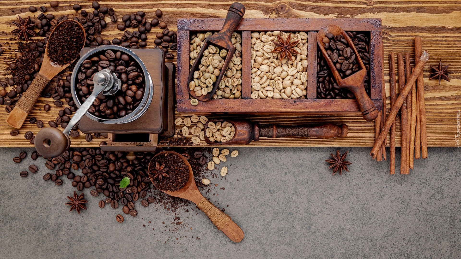 Edytor tapety: Młynek i kawa ziarnista na łopatkach