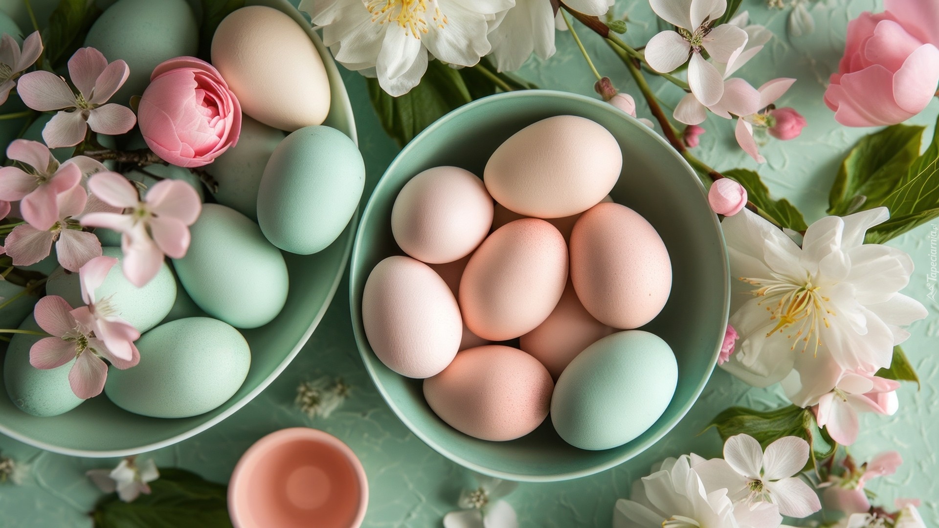 Edytor tapety: Kolorowe jajka w dwóch miskach obok ukwieconych gałązek