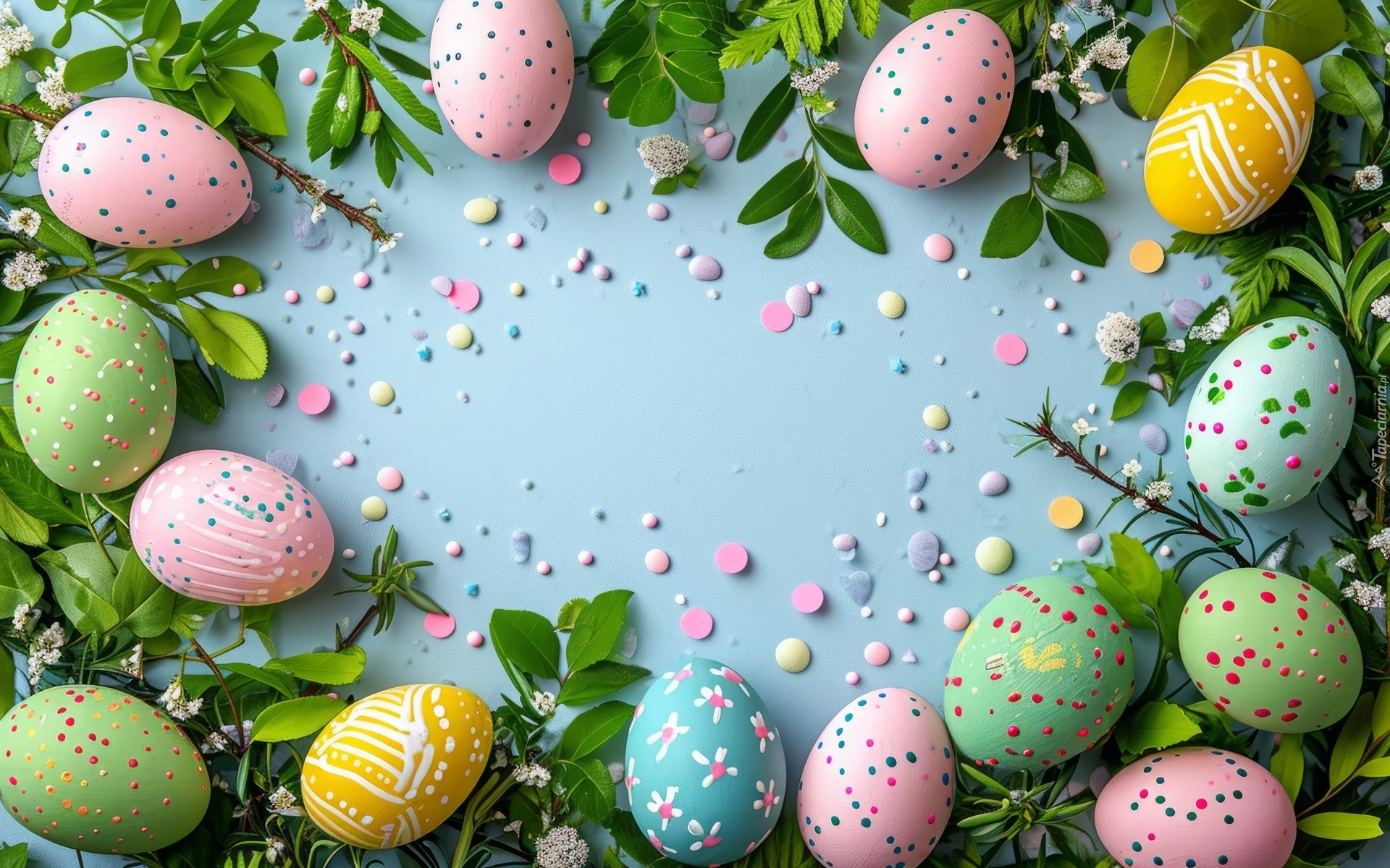 Edytor tapety: Kolorowe pisanki wśród zielonych gałązek na niebieskim tle
