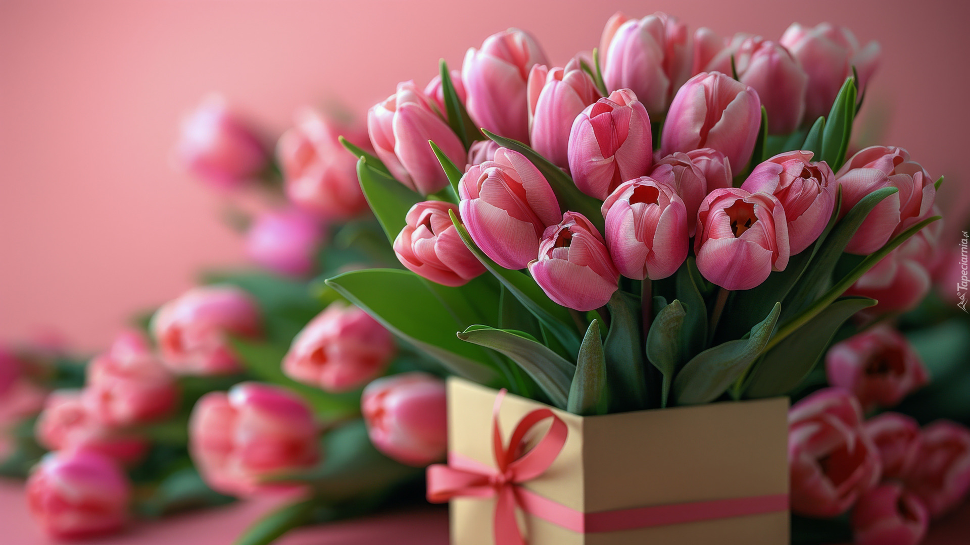 Edytor tapety: Różowe tulipany w pudełku i obok