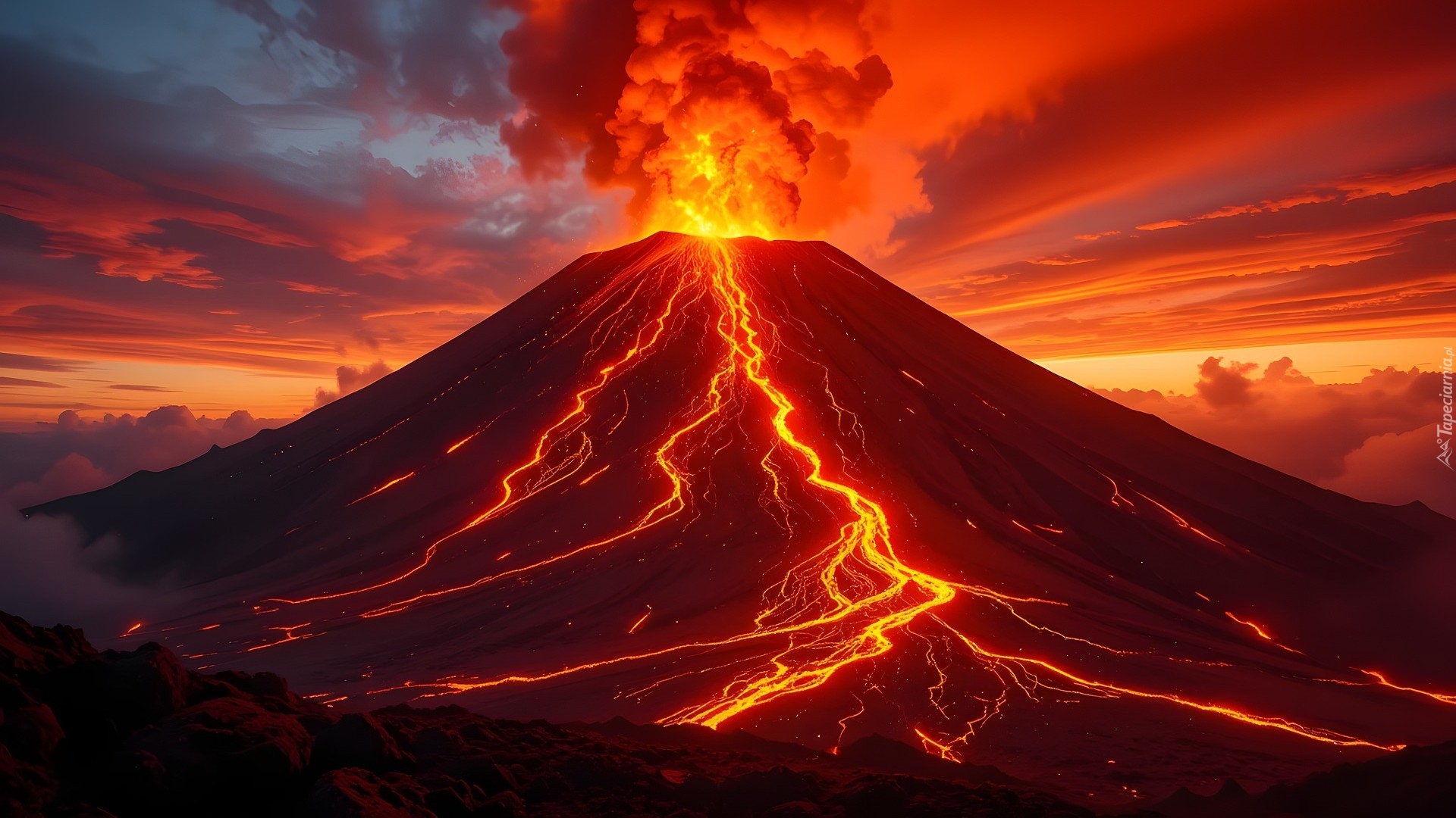 Edytor tapety: Erupcja wulkanu na tle zachodu słońca