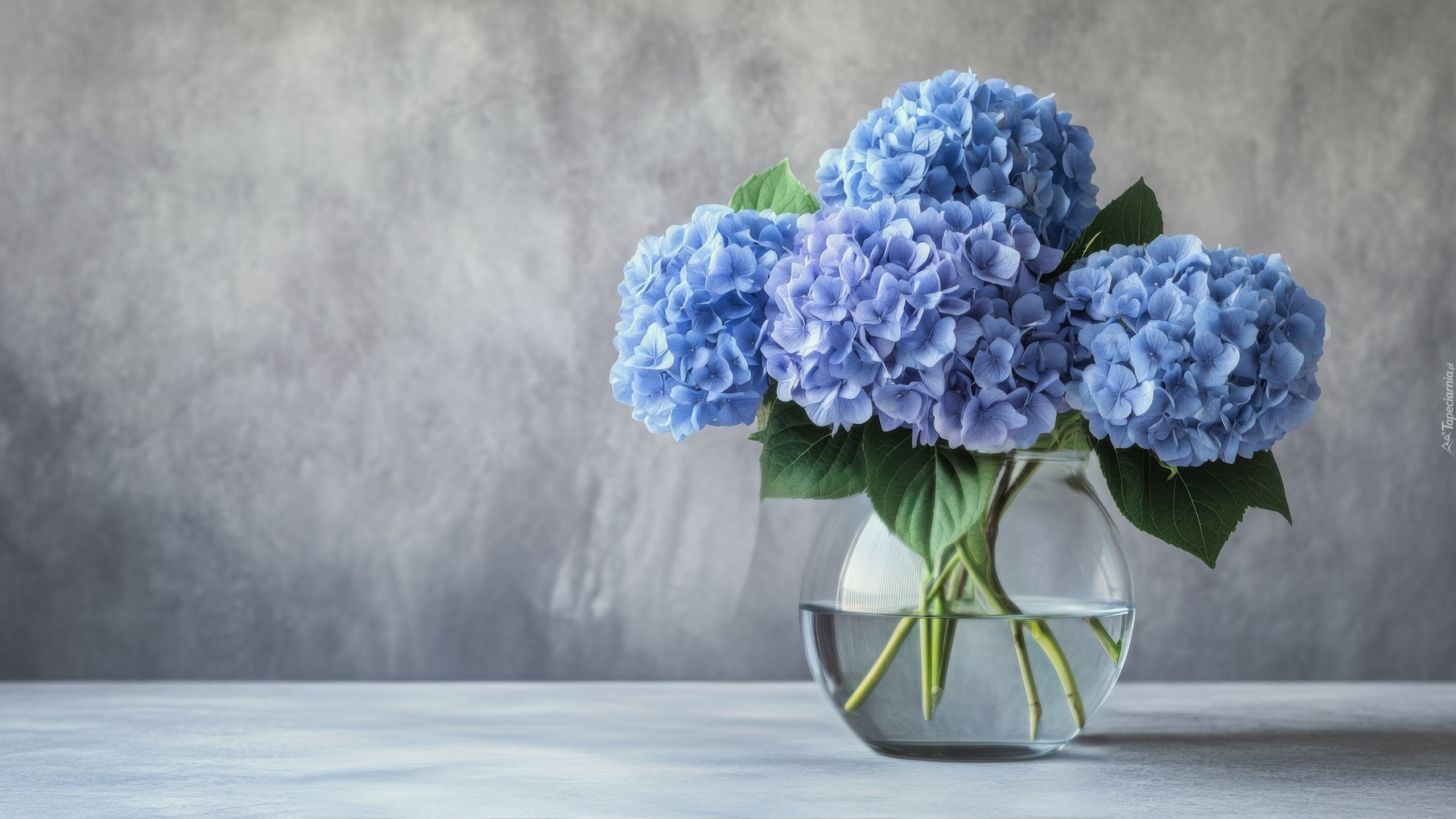 Edytor tapety: Niebieskie hortensje w szklanym wazonie