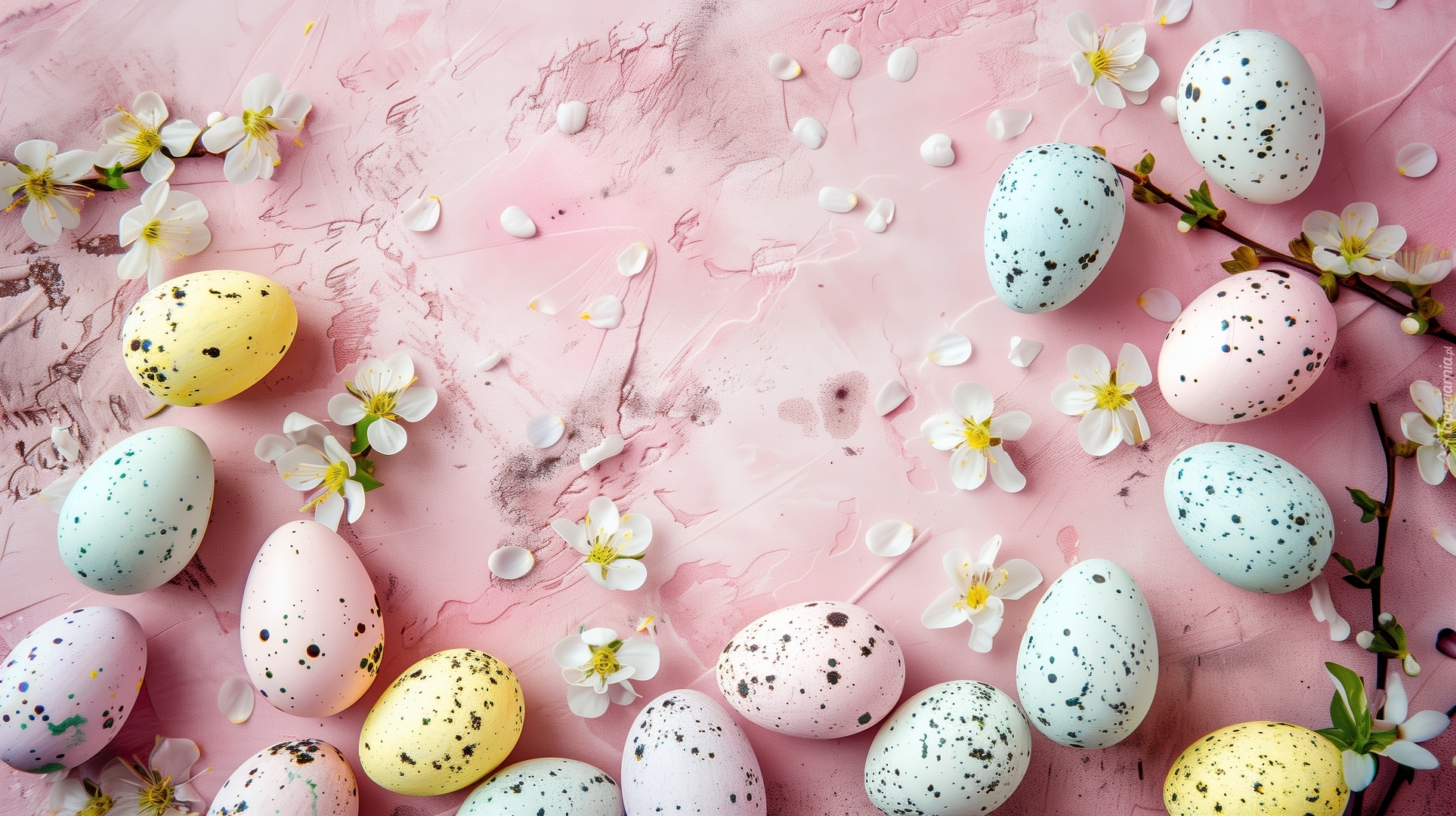 Edytor tapety: Kolorowe pisanki obok ukwieconych gałązek na różowym tle