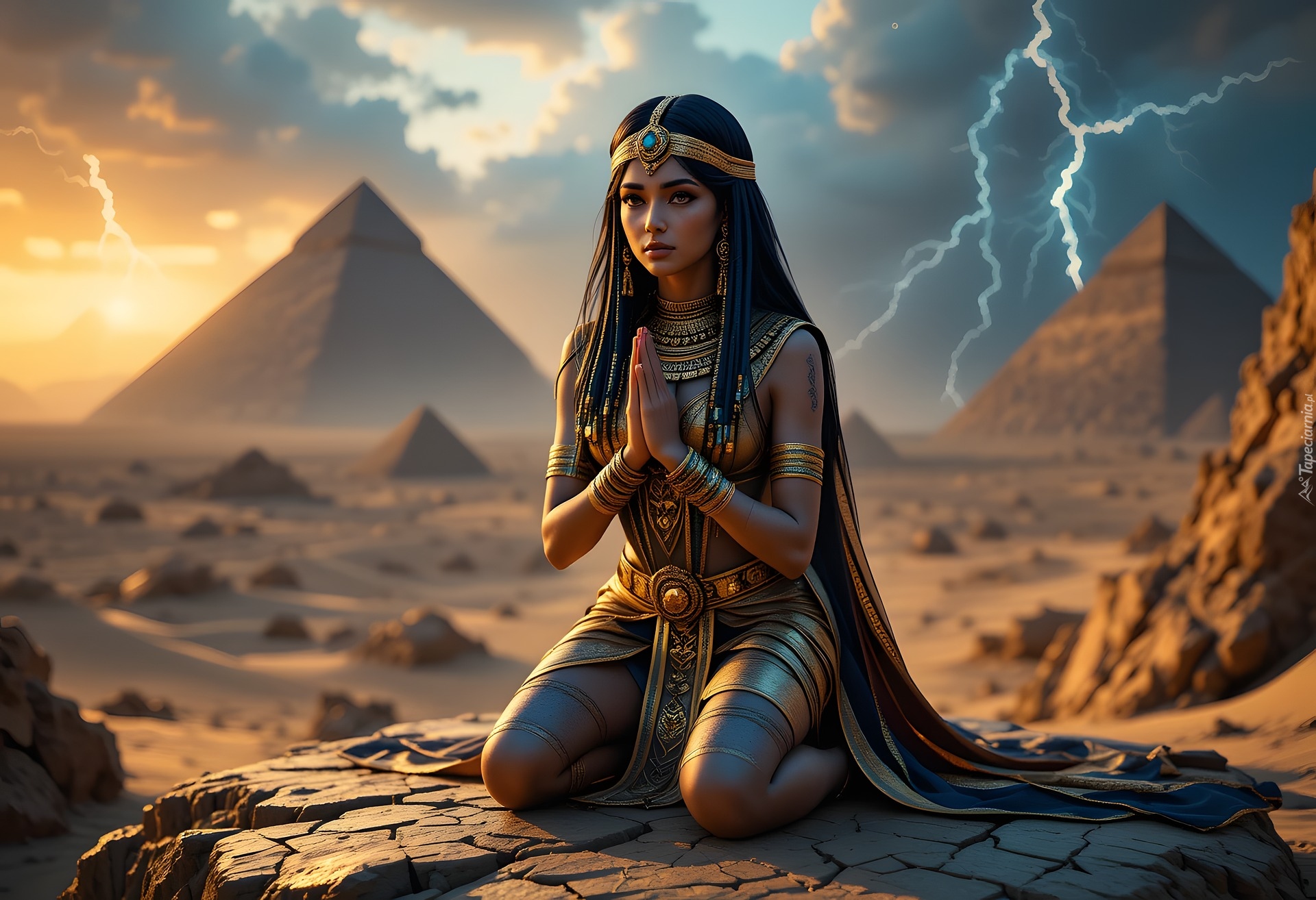 Edytor tapety: Klęcząca Egipcjanka na tle piorunów i piramid