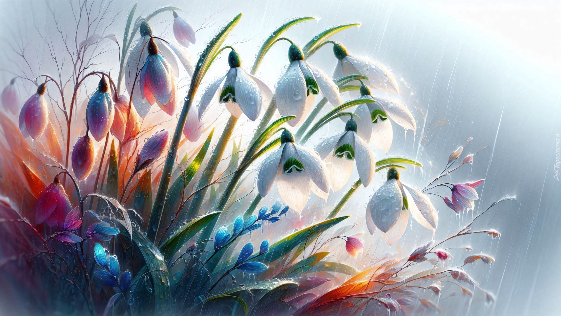 Edytor tapety: Mokre przebiśniegi w padającym deszczu