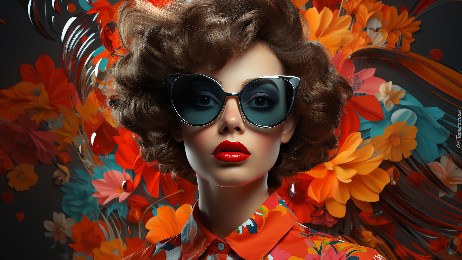 Edytor tapety: Kobieta w okularach na tle kwiatów
