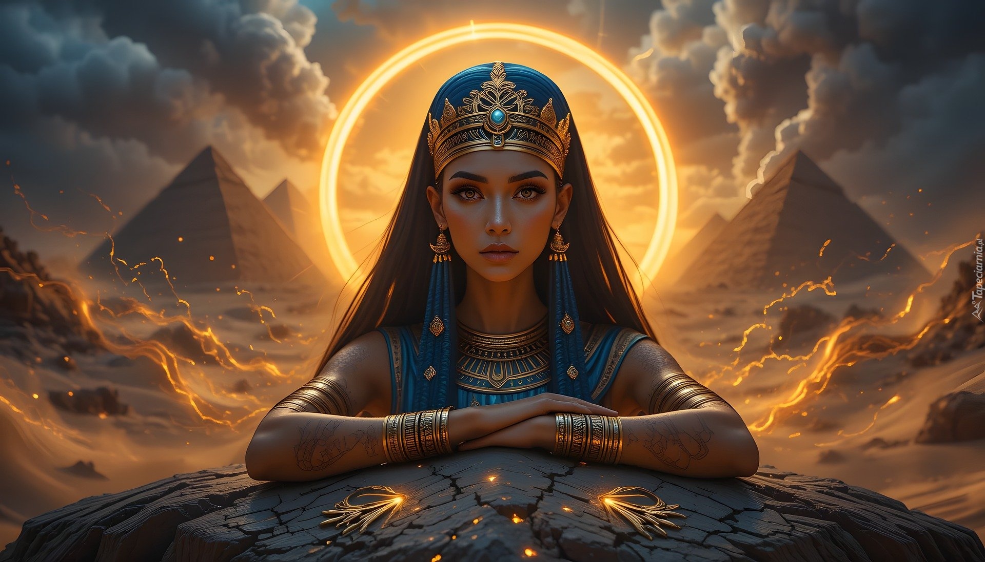 Edytor tapety: Egipcjanka oparta o skałę na tle piramid