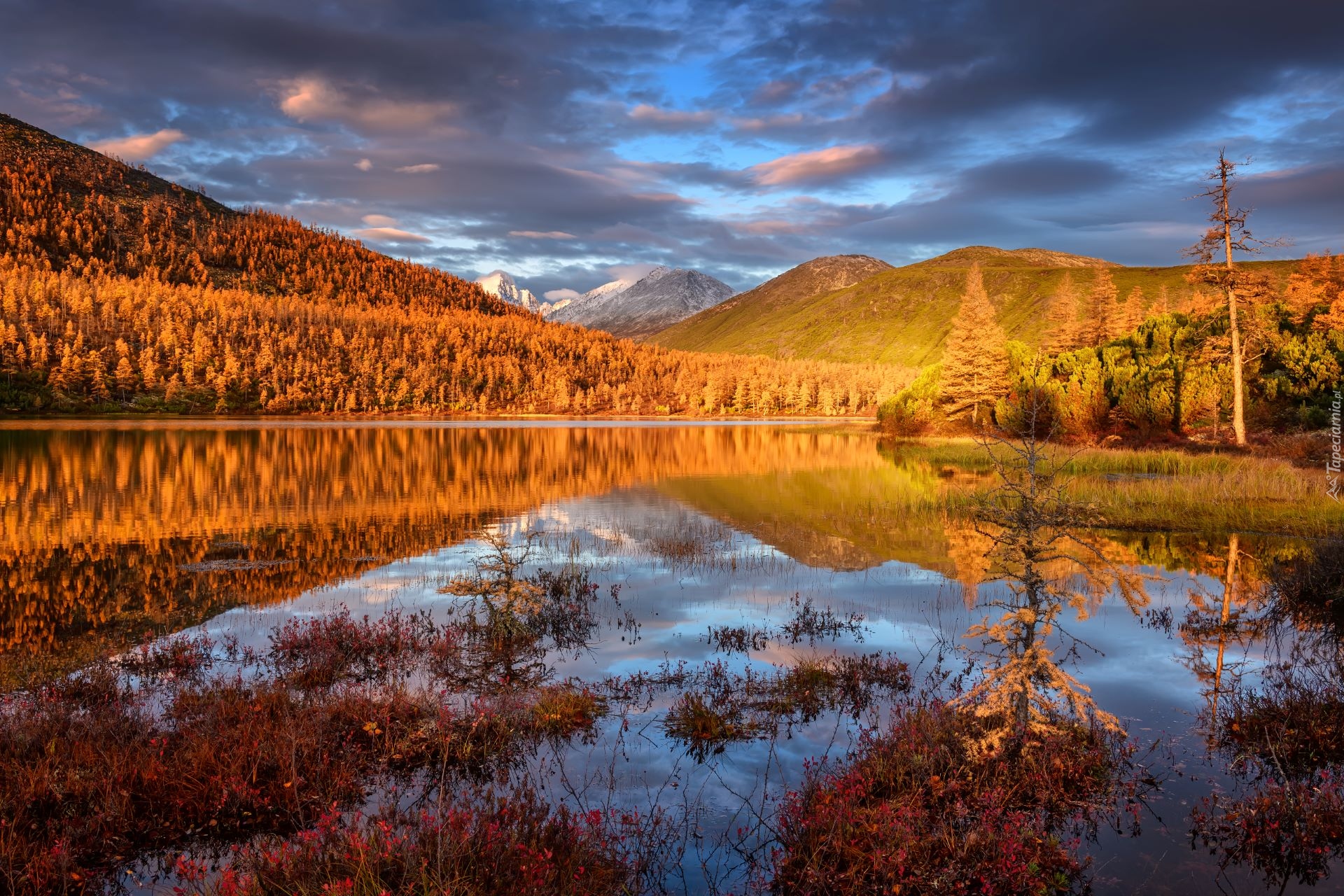Edytor tapety: Rozświetlone jesienne drzewa nad jeziorem na Kołymie