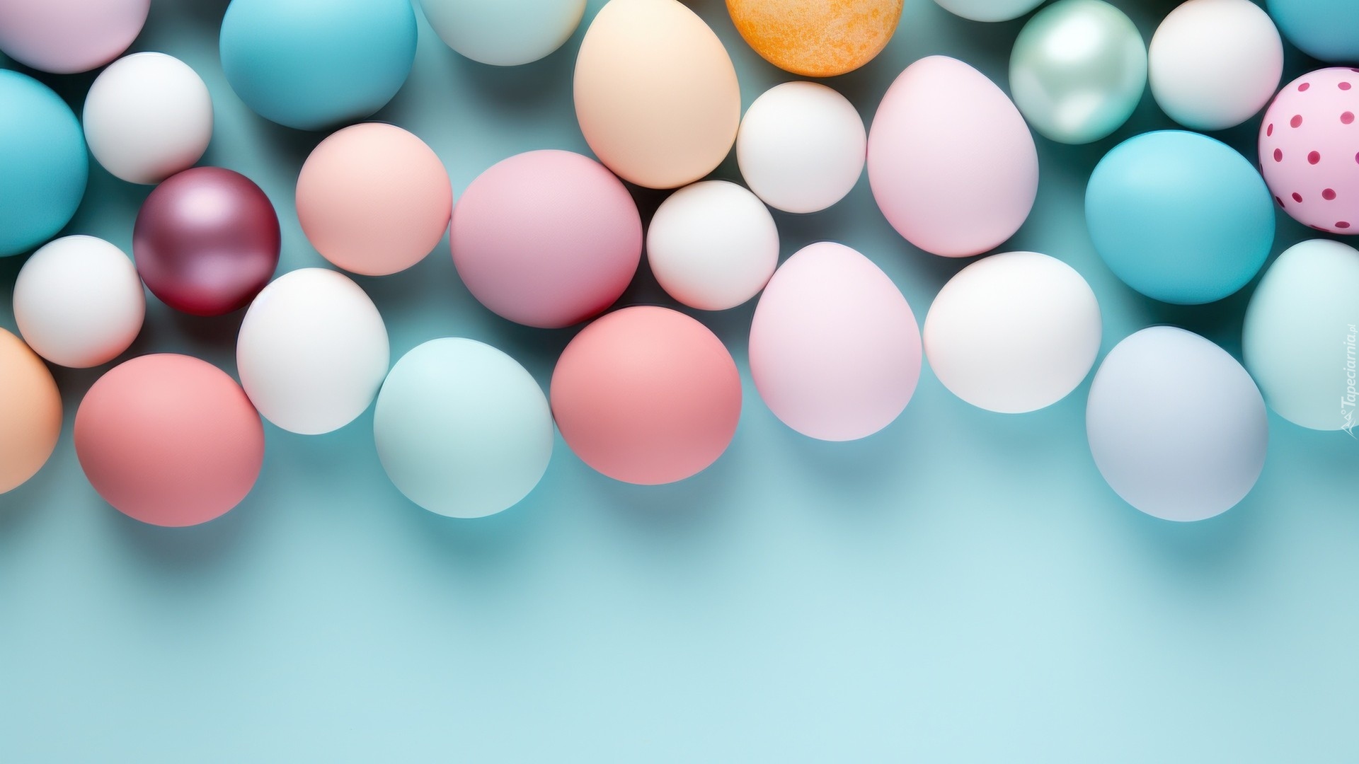 Edytor tapety: Kolorowe pisanki i kulki na niebieskim tle